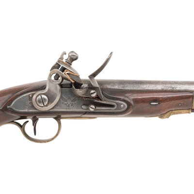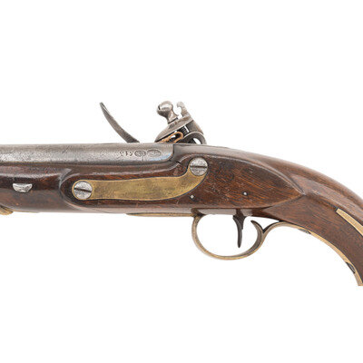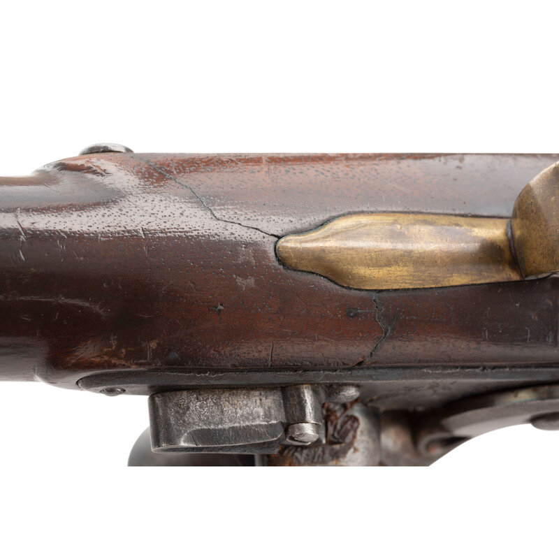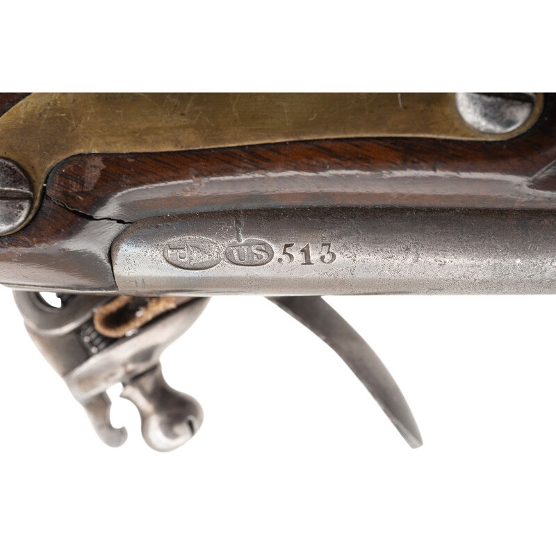 .54 caliber. 10" barrel with under lug. SN: 513. Bright finish, brass furniture, walnut stock. Single shot muzzleloading flintlock pistol with bead front sight and wooden ramrod. Standard Harpers Ferry lock markings and barrel proofs. Lock appears to have the original rounded, fenced and bridled integral iron pan intact with many parts apparently replaced, including the frizzen and probably the cock. Touchhole appears well centered, if a little high, in the pan. Breech shows indications of polishing and the breech plug tang shows some damage and chemical coloring. Markings are mostly clear and legible. Stock has been completely broken through the lock mortise and rebuilt with added finish to conceal much of the repair work, which is immediately obvious when the lock is removed. A weak cartouche is present on the counterpane. {ANTIQUE}