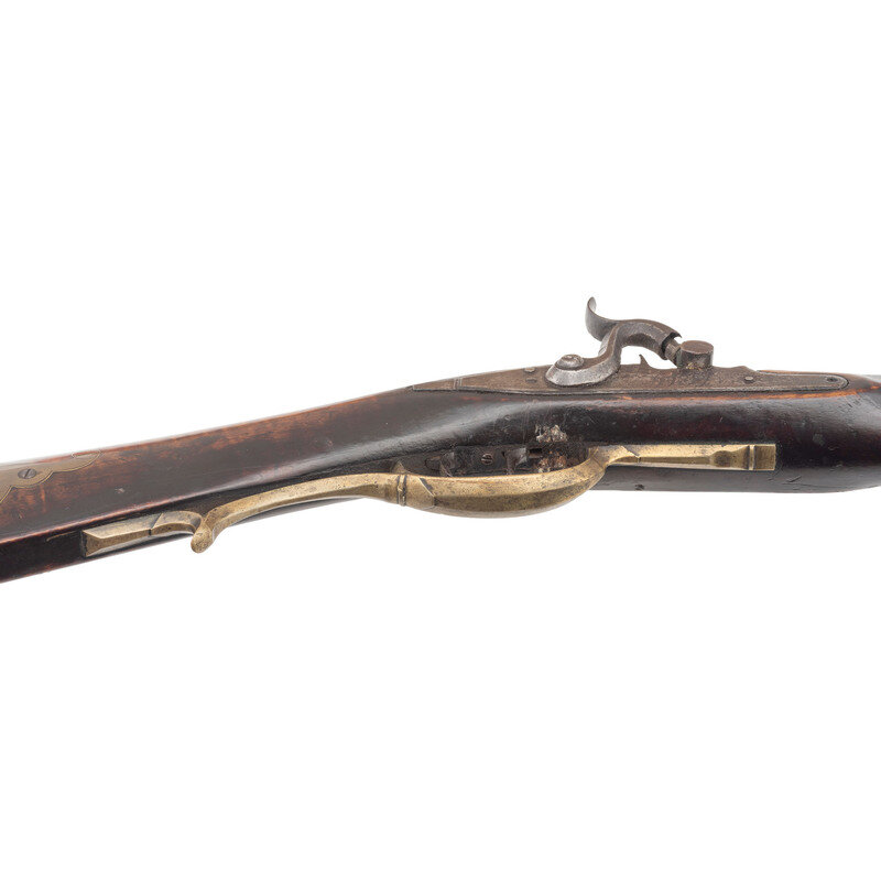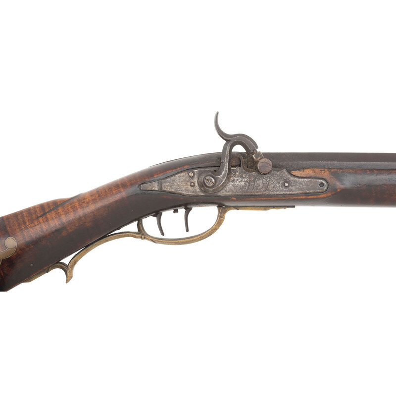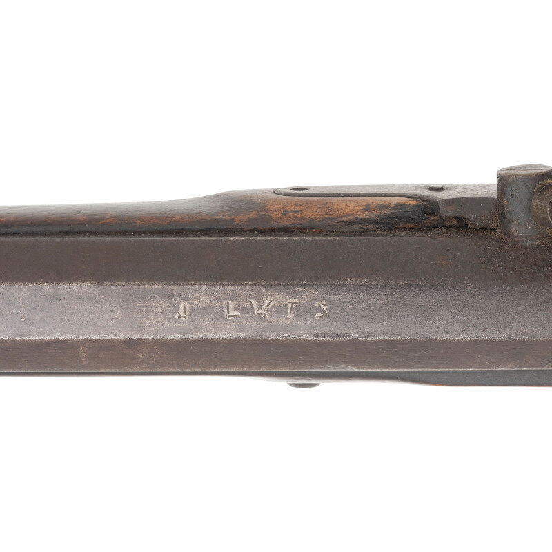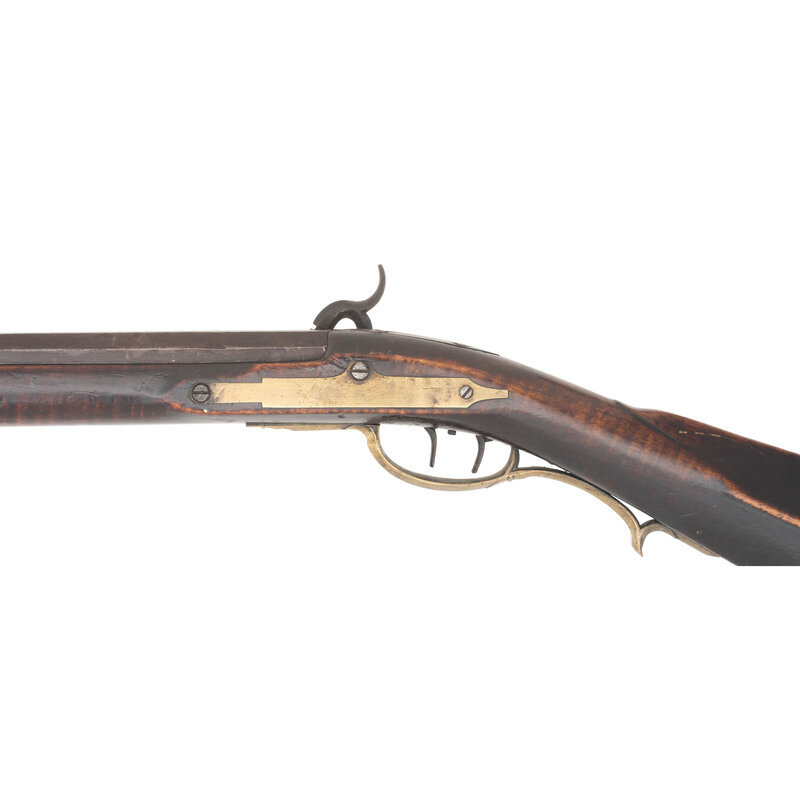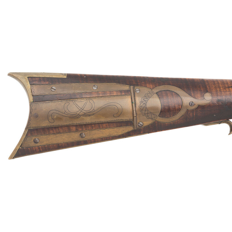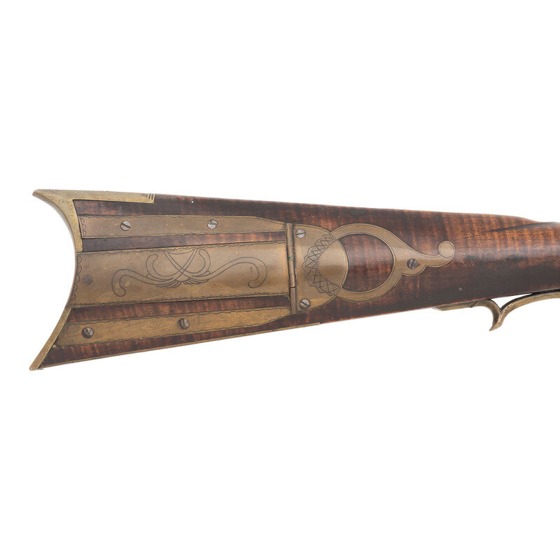 .32 caliber. 43.25" pinned octagonal barrel. NSN. Browned finish, brass furniture, faux striped hardwood stock with raised cheek rest. Single shot percussion muzzleloading rifle with double set triggers, fixed notch rear sight, Rocky Mountain front sight blade and lightly engraved four piece patchbox. Percussion altered lock with illegible signature, barrel is crudely marked J LUTZ, possibly Jesse Lutz of Lancaster, PA who worked in the mid-1800s. Includes a brass tipped wooden ramrod. {ANTIQUE}