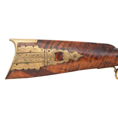.38 caliber. 40" pinned octagonal barrel. NSN. Browned finish, brass furniture and decorative inlays, faux striped hardwood stock with raised cheek rest and engraved four piece patchbox. Single shot muzzleloading percussion rifle with fixed notch rear sight, dovetailed blade front sight and double set triggers. Percussion lock sighed with a large "H" pierced by an arrow with the top flat of the barrel signed in fancy script J B Hixson. A modern brass jag, spare percussion cone and a small patch are contained in the patchbox. A wooden ramrod is included. {ANTIQUE}