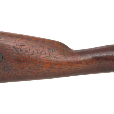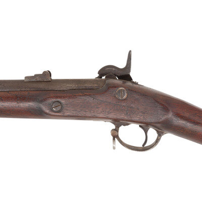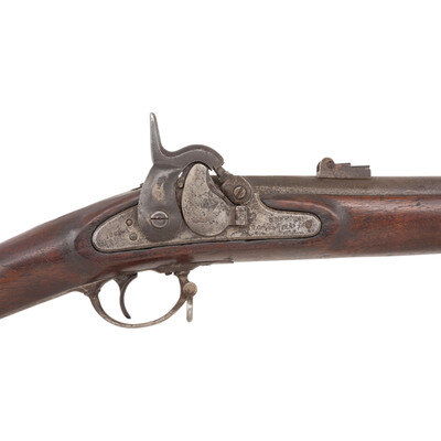 .58 caliber. 33" barrel. NSN. Bright finish with some old applied blue, long brass nose cap, iron furniture, walnut stock with iron patchbox, entire butt spliced on diagonally at wrist. Single shot muzzleloading rifle with saber bayonet lug, Maynard's patent tape priming lock, incorrect M1861 3-leaf rear sight, M1855 rifle front sight, sling swivels and a reproduction ramrod. Harper's Ferry lock with standard markings and dated 1861. No visible barrel markings or cartouches. Butt carved with several letters. Heavily repaired and rebuilt with spliced butt stock, incorrect early brass nose cap, replaced barrel bands, incorrect rear sight, replaced reproduction bayonet lug and reproduction ramrod. {ANTIQUE}