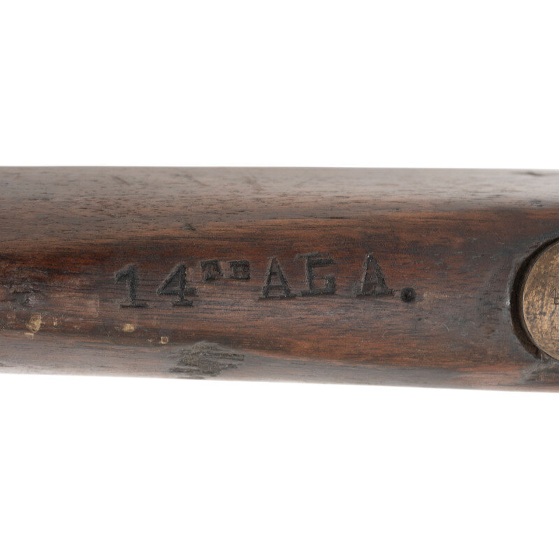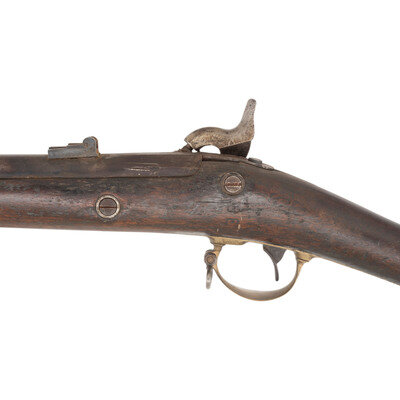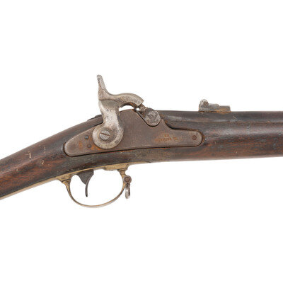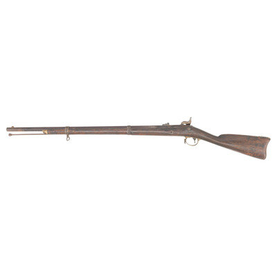 .60 caliber smoothbore. 33.25" barrel. NSN. Bright finish, iron and brass furniture, walnut stock. Single shot percussion muzzleloading "rifle" that has been bored smooth and is a composite assembly of parts, with the time period of the assembly being unclear. Barrel is a shortened and smoothbored US Special Model 1861 rifle musket barrel with an eagle on the bolster. The lock is an 1863 dated Richmond marked lock that has an incorrect 1863/64 pattern US hammer on it and mostly reproduction parts on the inside. The barrel has an M1861 rear sight and a reproduction Barleycorn US rifle musket front sight. The two piece brass triggerguard may be from something like a Zouave rifle and the poorly fit brass buttplate is stamped "4" twice on the tang. Both sling swivels and the ramrod are aged reproduction parts. The lower barrel band is ill fitting and in near relic condition and the upper band appears to be a low quality aged reproduction. The top of the stock comb is deeply stamped 14TH ALA. An interesting gun with a well worn and interesting appearance whose beauty is in the eye of the beholder. {ANTIQUE}