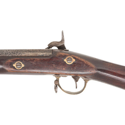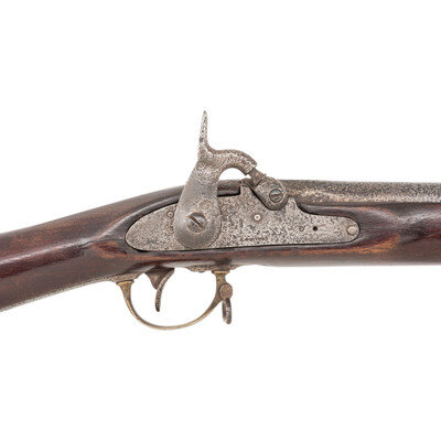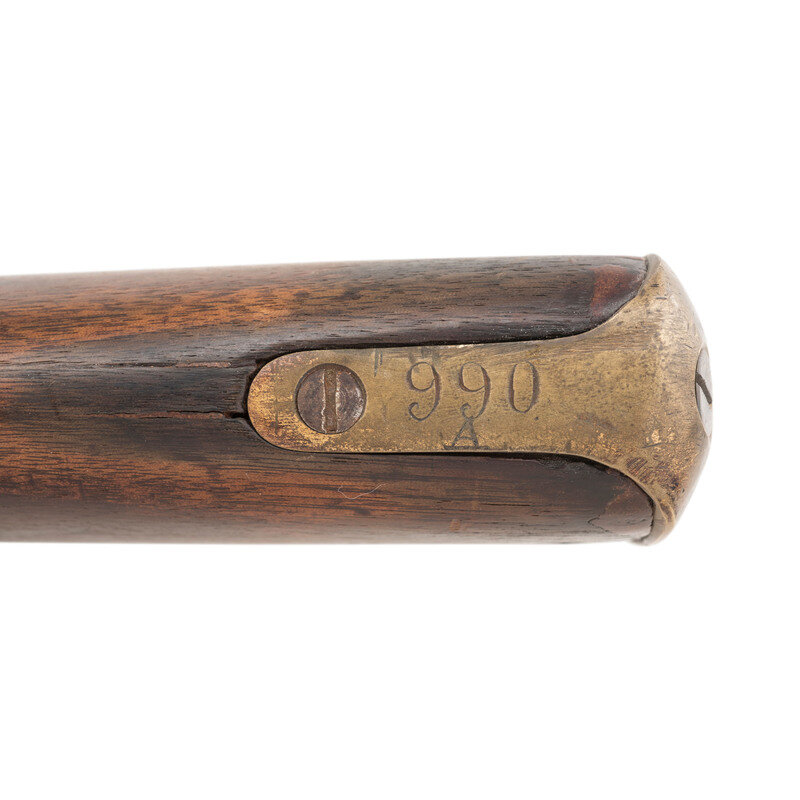 .59 caliber smoothbore. 40" barrel. NSN. Bright finish, brass furniture, walnut stock. Single shot percussion muzzleloading rifle musket with added M1873 Trapdoor rear sight, Barleycorn front sight, three solid barrel bands retained by springs, sling swivels and an iron ramrod. Standard Whitney lock markings. A Confederate blockade run Pattern 1853 Enfield buttplate engraved 990/A has been installed on the gun, possibly during the period of use. An interesting Civil War era rifle musket. {ANTIQUE}