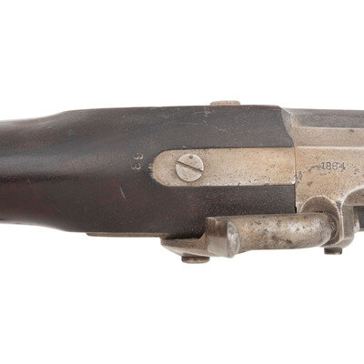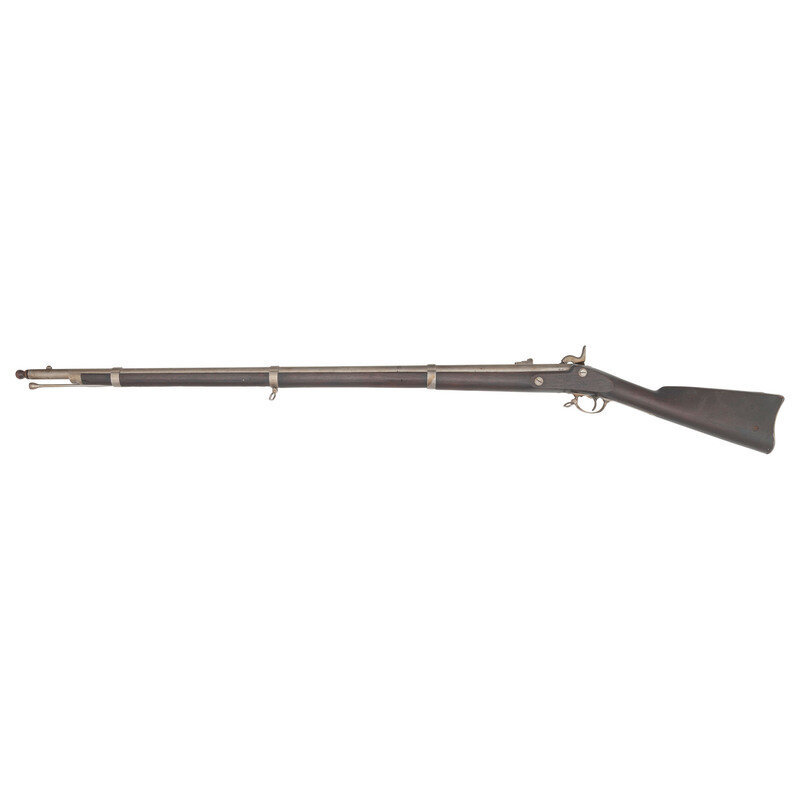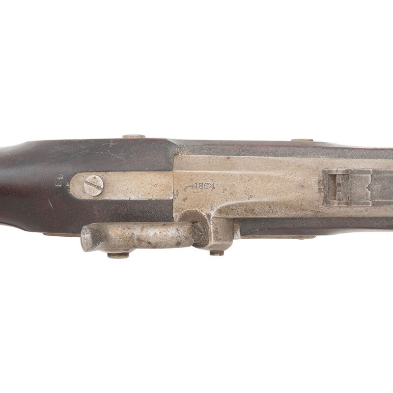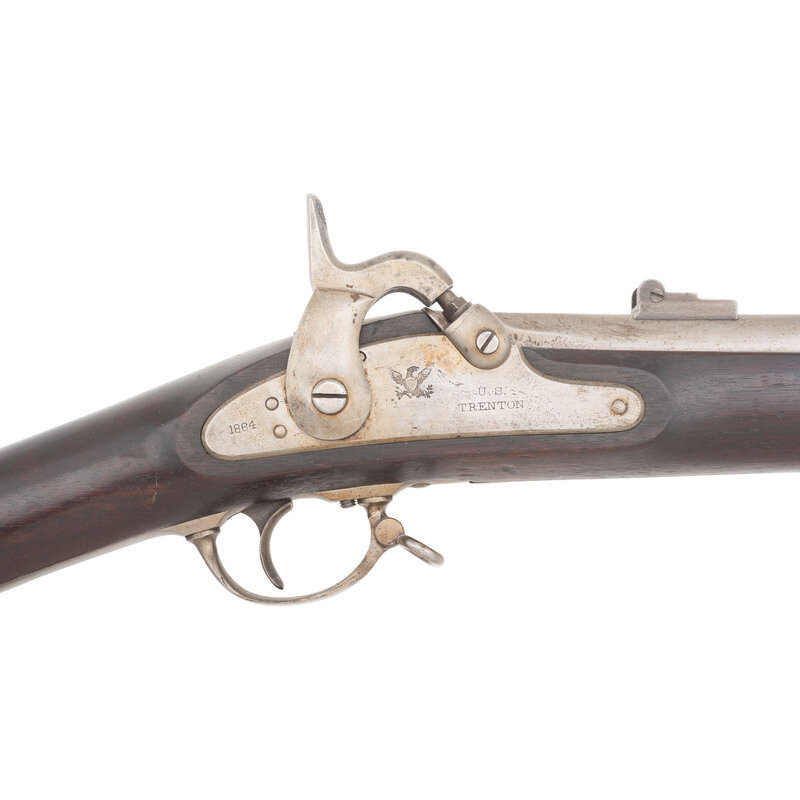 .58 caliber. 40" round barrel secured by three flat, spring-retained bands. NSN. Bright finish, steel furniture, walnut stock. Single shot percussion muzzleloading rifle musket with three leaf M1861 pattern rear sight, Barleycorn combination front sight and socket bayonet lug, sling swivels and a swelled shank tulip head ramrod. Lock marked with a {Spread-Winged Eagle} and U.S./TRENTON forward of the hammer and dated 1864 horizontally at the tail. Top of breech dated 1864 as well. Left angled flat with the usual V/P/{Eagle Head} proof marks with the left barrel flat and counterpane showing NJ surcharges for New Jersey. The number 63 is stamped in the wood behind the breech plug tang and three number "8" marks are stamped in the top of the comb, forward of the buttplate tang. Includes an original tompion in the muzzle. {ANTIQUE}
