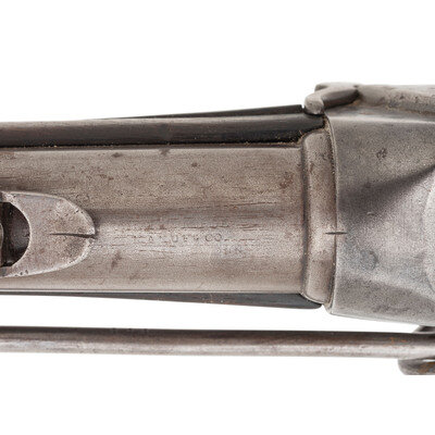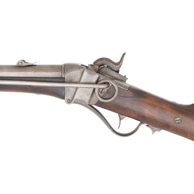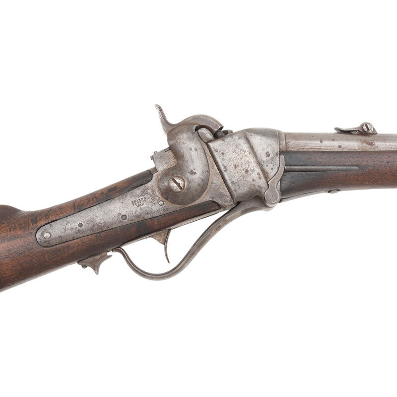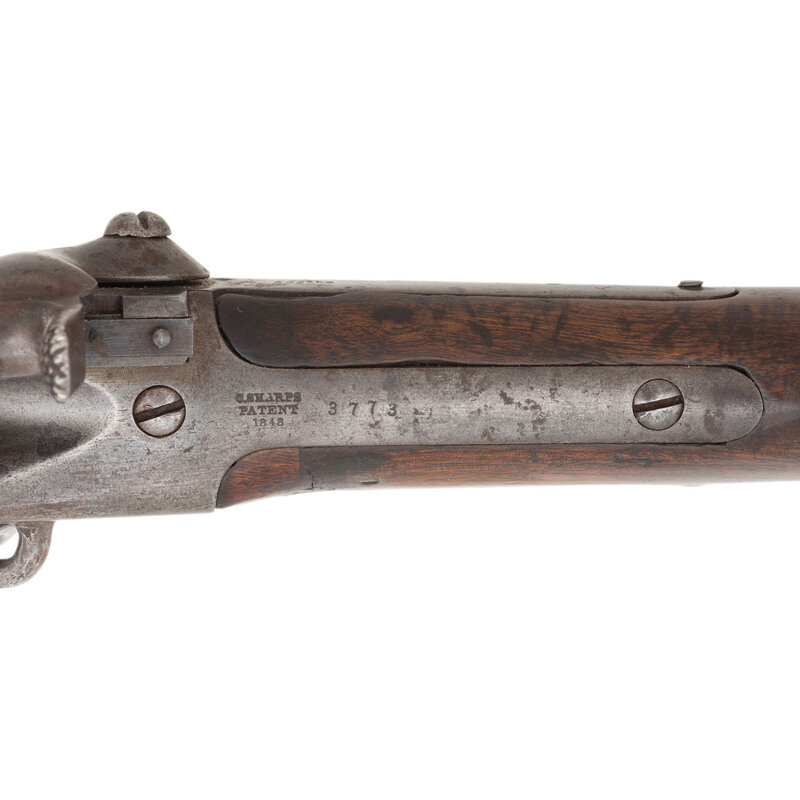 .54 caliber. 21.25" barrel. SN: 3773. Bright finish, brass furniture, smooth walnut stock with patchbox and smooth walnut forend. Single shot percussion breechloading dropping block carbine with Lawrence patent pellet priming system, folding "squirrel ear" rear sight, brass fixed blade front sight and 9" saddle bar with ring. Lock with weak 1852 Sharps patent marking, tang with weak 1848 Sharps patent marking and very weak barrel markings that are essentially illegible. Matching serial numbers on receiver tang, breech block, under barrel and in forend channel. {ANTIQUE}