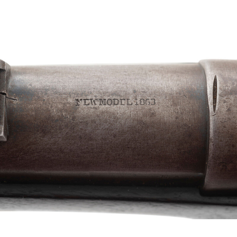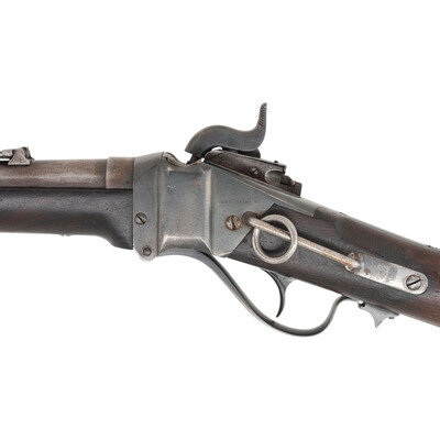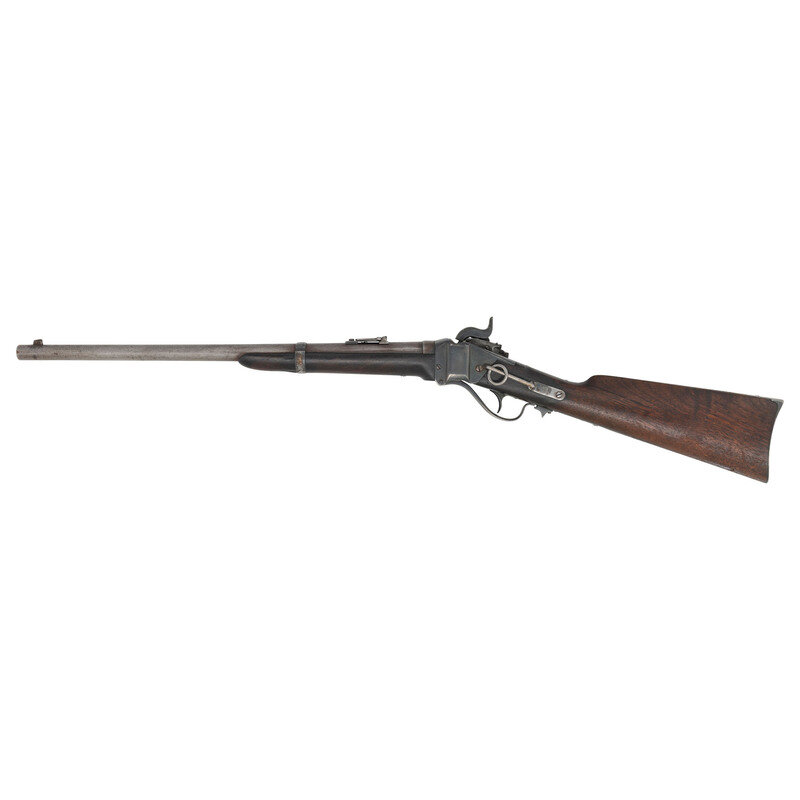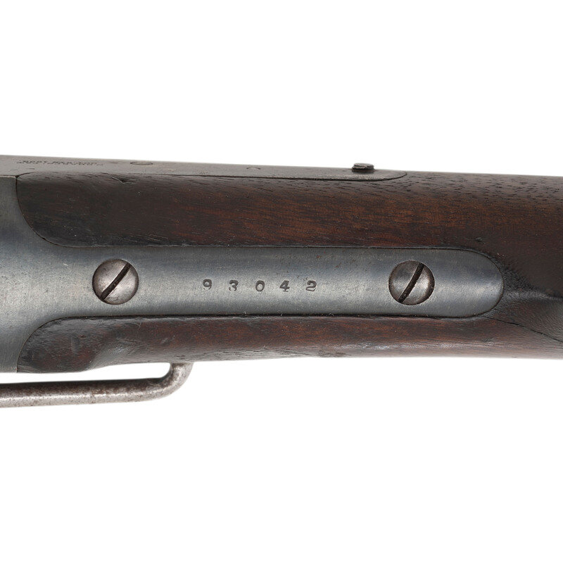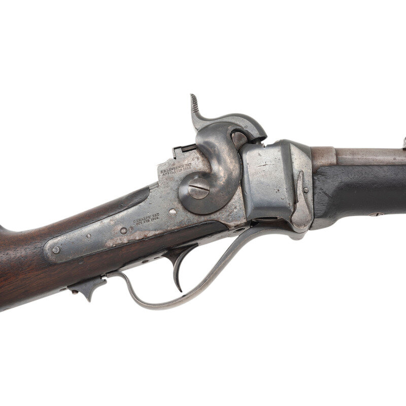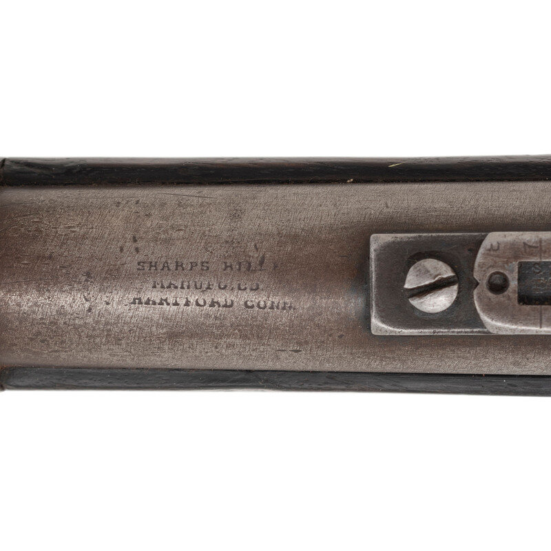 .52 caliber. 20" round barrel secured by a single spring-retained barrel band. SN: 93042. Blued and color casehardened finish, iron furniture, walnut stock and smooth walnut forend. Single shot percussion falling block breechloading carbine with military ladder rear sight, German silver front sight blade in iron base and sling bar and ring opposite lock. Lock marked in two lines behind the hammer SHARPS' PAT./OCT 5th 1852. Lock additionally marked at the top behind the primer mechanism RS LAWRENCE PAT/APRIL 12th 1859. Reverse of breechblock marked C SHARPS' PAT/SEPT 12th, 1849. Barrel marked NEW MODEL 1863 between the rear sight and the breech, and SHARPS RIFLE/MANUFG CO/HARTFORD CONN forward of the rear sight in three lines. No cartouches remain visible in the wood. This gun was not listed by serial number in the Springfield Research Service serial number books, however #93064, only 22 numbers away was issued to Company H of the 5th Illinois Volunteer Cavalry. {ANTIQUE}