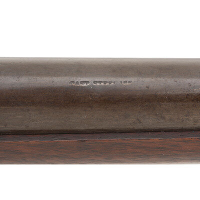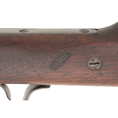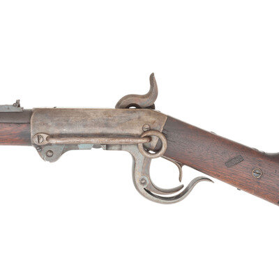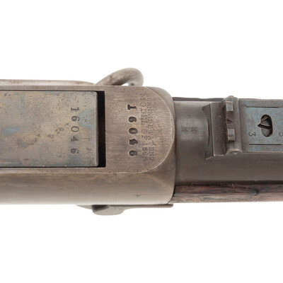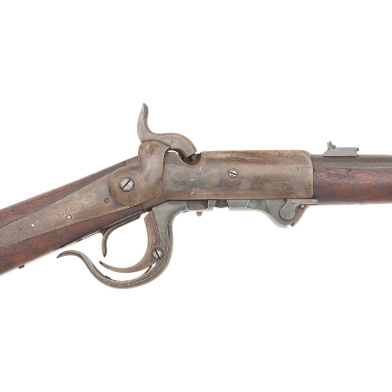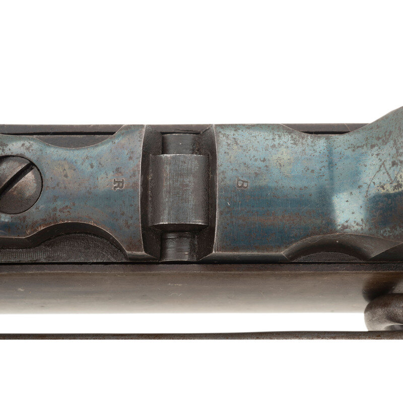 .54 caliber. 21" round barrel secured by a single spring-retained barrel band. SN: 16046. Blued and color case hardened finish, smooth walnut stock and forend. Single shot percussion carbine with tilting block receiver, L-shaped leaf rear sight, pinched front sight blade, sling swivel in toe of stock and saddle bar and ring opposite lock. Lock marked in two lines behind the hammer BURNSIDE RIFLE CO/PROVIDENCE, RI. Chamber marked in two lines BURNSIDE PATENT/MODEL OF 1864. Barrel marked in a single line forward of the rear sight, poorly struck and off center, CAST STEEL 1864. A clear script RKW (Robert K Whitely) cartouche at reverse wrist. Matching serial numbers on receiver and breech block. This carbine was not located in the Springfield Research Service database, however the closest one was Burnside Carbine #16114 which was issued to E company of the 4th Wisconsin Cavalry. A very nice condition example of one of the most widely used and successful of the Civil War era breechloading percussion ignition carbines. {ANTIQUE}