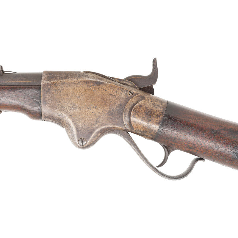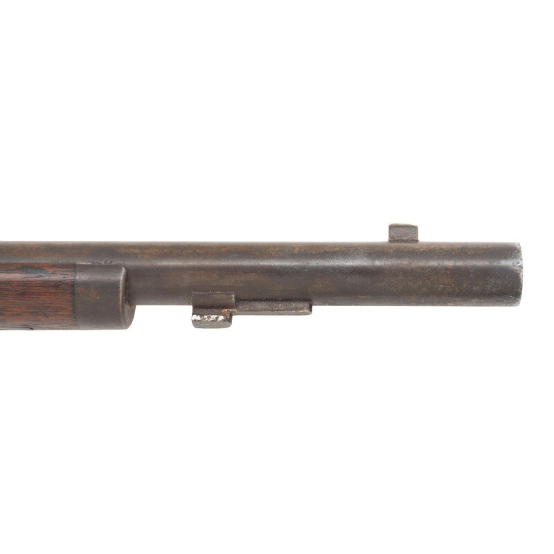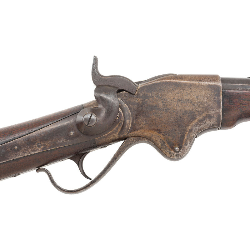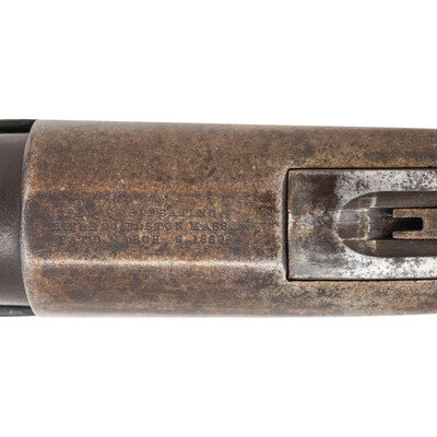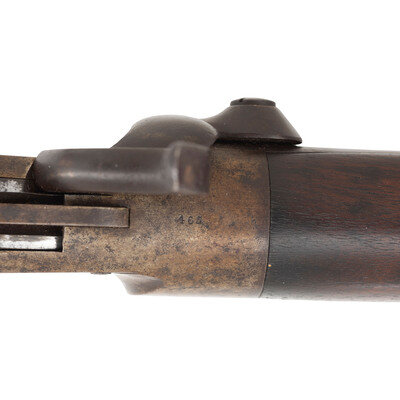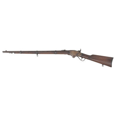 .56-56 Spencer. 30" barrel. SN: 465. Blued and color casehardened finish, smooth walnut stock and forend secured by three solid, rounded spring retained bands. Lever action repeating rifle with manually cocked hammer and tubular magazine in butt, equipped with the M1860 folding leaf rear sight, Barleycorn front sight, saber bayonet lug with guide key under the barrel 2.5" from the muzzle, and sling swivels on the middle barrel band and in the toe of the stock. Top of receiver with standard three-line Spencer markings. No visible cartouches at wrist. The correct pattern 1860 magazine follower tube with smooth floor plate is in place. While typically thought of as an infantry or cavalry weapon, the very first Spencer rifles delivered to the US Government during the Civil War were some 800 rifles with saber bayonet lugs that were purchased by the US Navy. These guns are found nominally in the 1 to 800 serial number range and do not have cartouches or inspection marks as found on the later delivery of infantry rifles and cavalry carbines. These low numbered, saber bayonet equipped Spencer rifles are quite rare and do not appear for sale very often. {ANTIQUE}