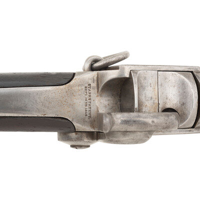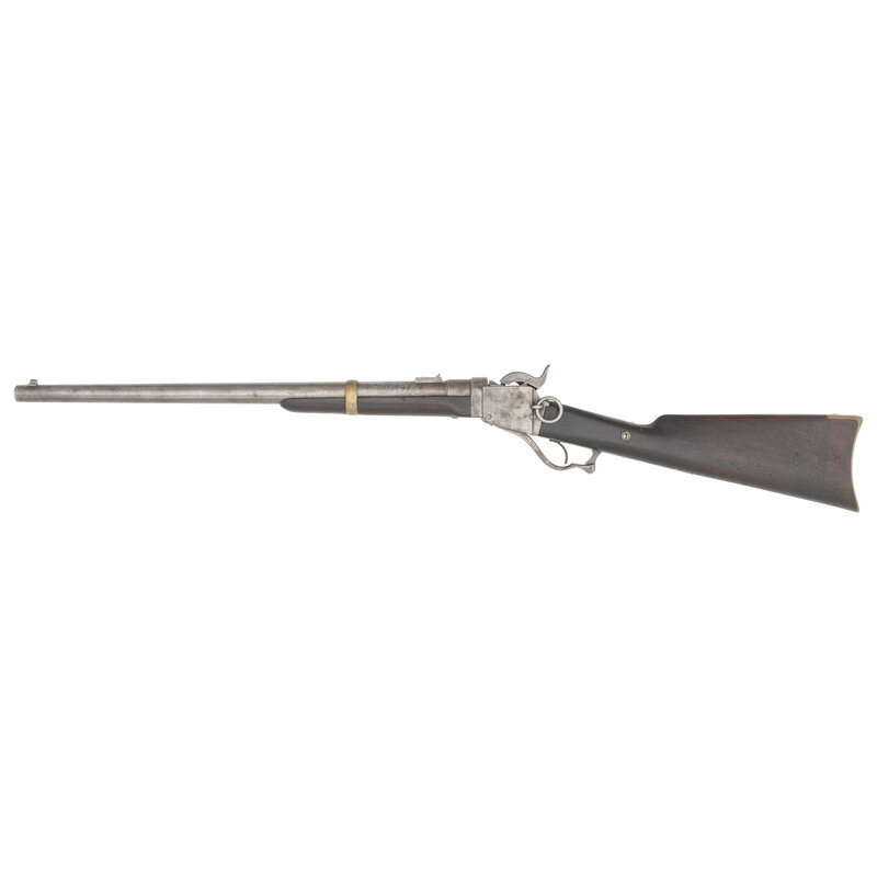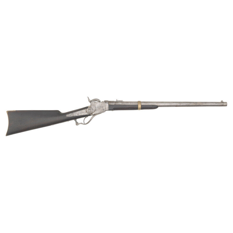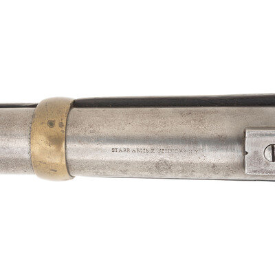 .54 caliber. 21" barrel. SN: 20718. Blued and color casehardened finish, brass furniture, walnut stock and forend secured by a screw and a single solid, spring-retained brass barrel band. Single shot dropping breech percussion breechloading carbine with L-shaped leaf rear sight, front sight blade, and saddle ring opposite lock. Back action lock marked in two lines STARR ARMS CO/YONKERS, N.Y. Barrel marked STARR ARMS CO YONKERS, N.Y. in a single line between the rear sight and the barrel band. Upper tang marked in two lines STARR'S PATENT/SEPT. 14TH, 1856. H.G.S. sub-inspection mark on left of chamber. No cartouche visible in wood. Some 20,601 were produced circa 1862-1865 with the majority seeing Civil War service with Union Cavalry regiments, including the 1st Arkansas, 5th Kansas and 24th New York Cavalry. A search of the Springfield Research Service serial number books did not find this carbine, with the closest numbers found being #20702 and #20722, both of which were issued to Company K of the 16th Missouri Cavalry. {ANTIQUE}