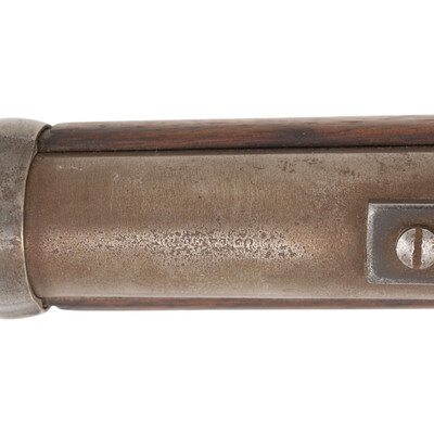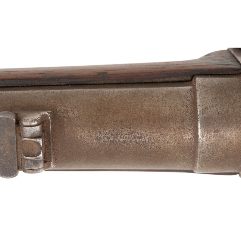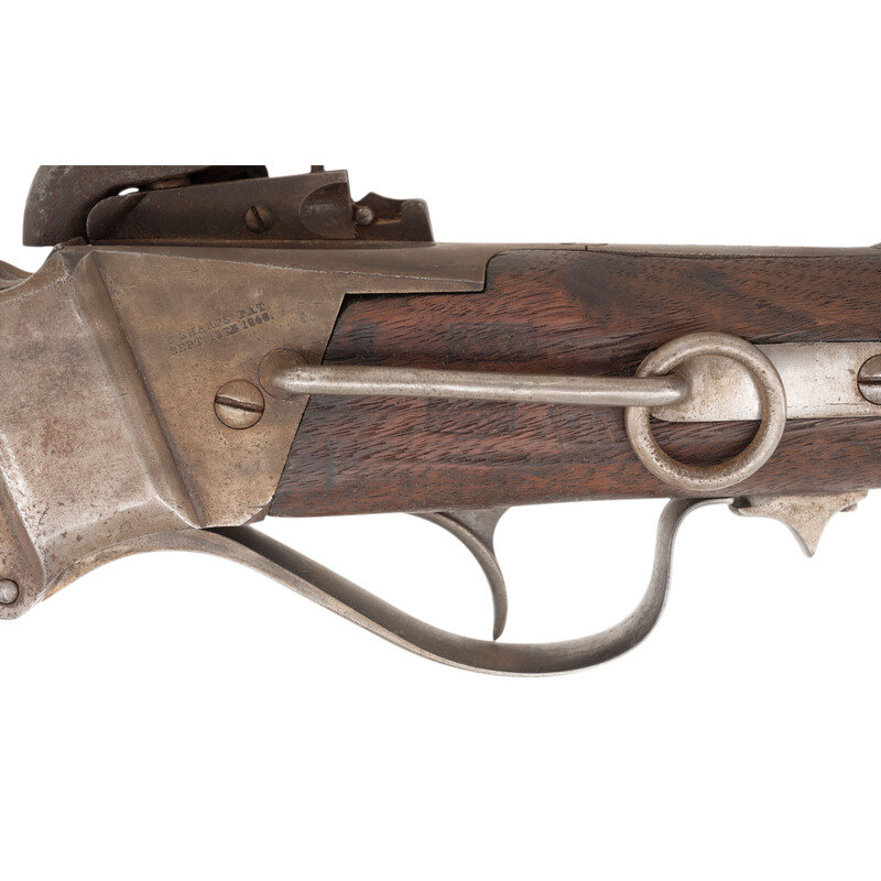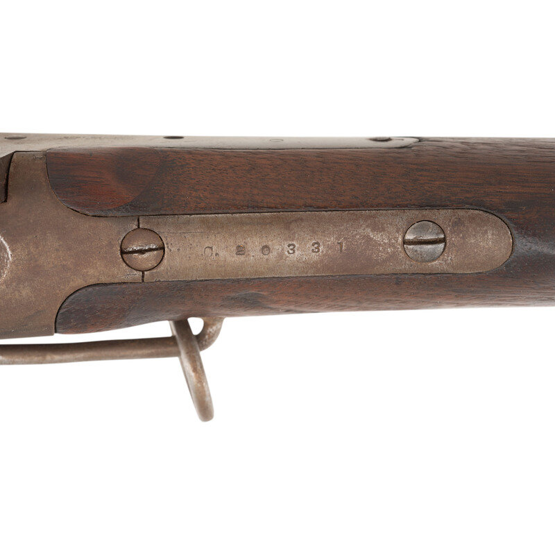 .52 caliber. 22" barrel. SN: C20331. No finish remaining, mostly iron furniture, added Mississippi Rifle patchbox in stock, walnut stock and forend. Single shot breechloading percussion carbine with short ladder Lawrence patent rear sight, fixed front sight blade, Lawrence patent pellet primer system and sling bar and ring. Standard Sharps markings on lock and receiver are mostly legible, barrel markings very weak. Weak cartouches above and below the sling bar. Mississippi Rifle patchbox added to the stock. {ANTIQUE}