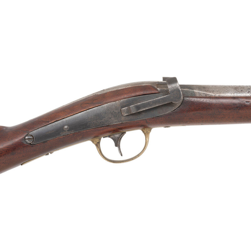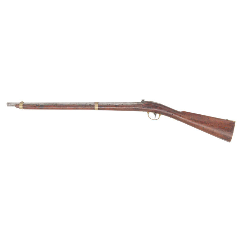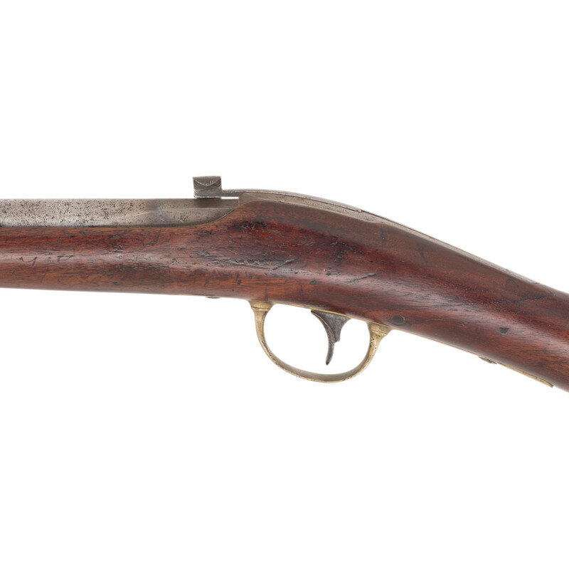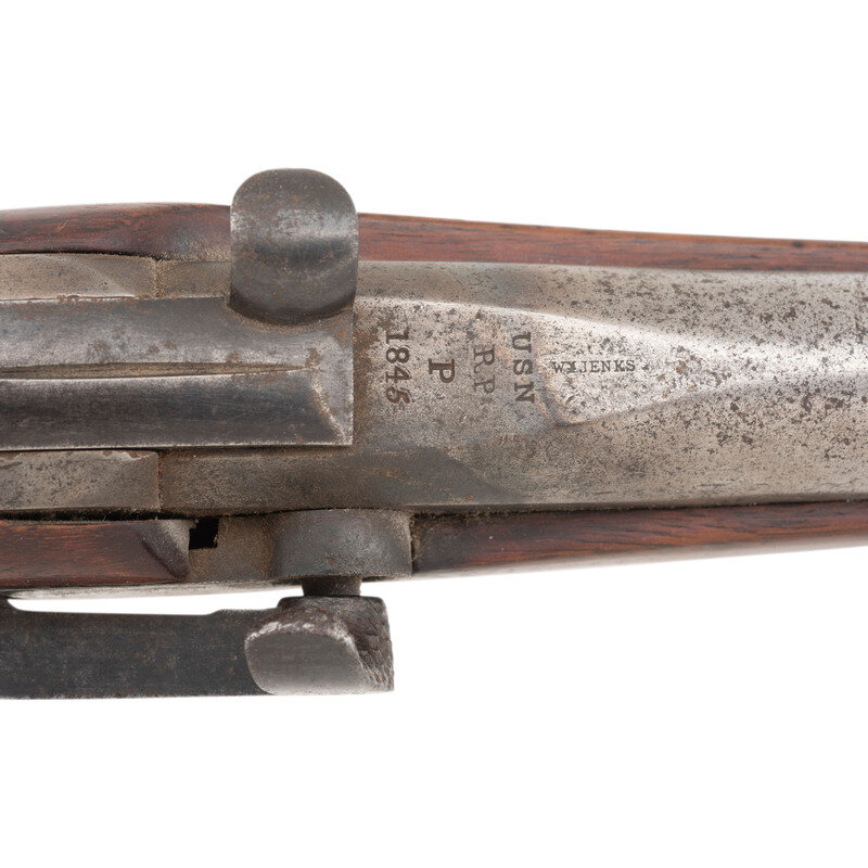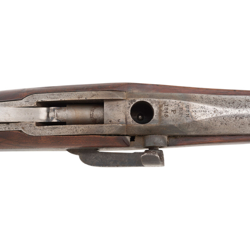 .52 caliber. 24" barrel. NSN. Browned and color casehardened finish, brass furniture, walnut stock with two screw retained flat brass barrel bands. Single shot percussion mule ear lock breechloading carbine with unaltered round hole loading aperture, lightly rifled bore, sighting groove in breech lever and fixed front sight blade on upper barrel band. Standard Ames and Jenks markings on lock, standard markings on breech, which is dated 1845. Retains the original, unaltered round hole loading aperture, but strangely the bore is lightly rifled. The original configuration as delivered was a round hole and smoothbore, with most guns later being altered to an oval loading hole with a deeply rifled bores. Round hole examples are very scarce, but the presence of light rifling suggests this gun may have been part of some sort of experimental trials regarding the best way to upgrade the carbines. A very scarce Mexican War to American Civil War era US naval carbine. {ANTIQUE}