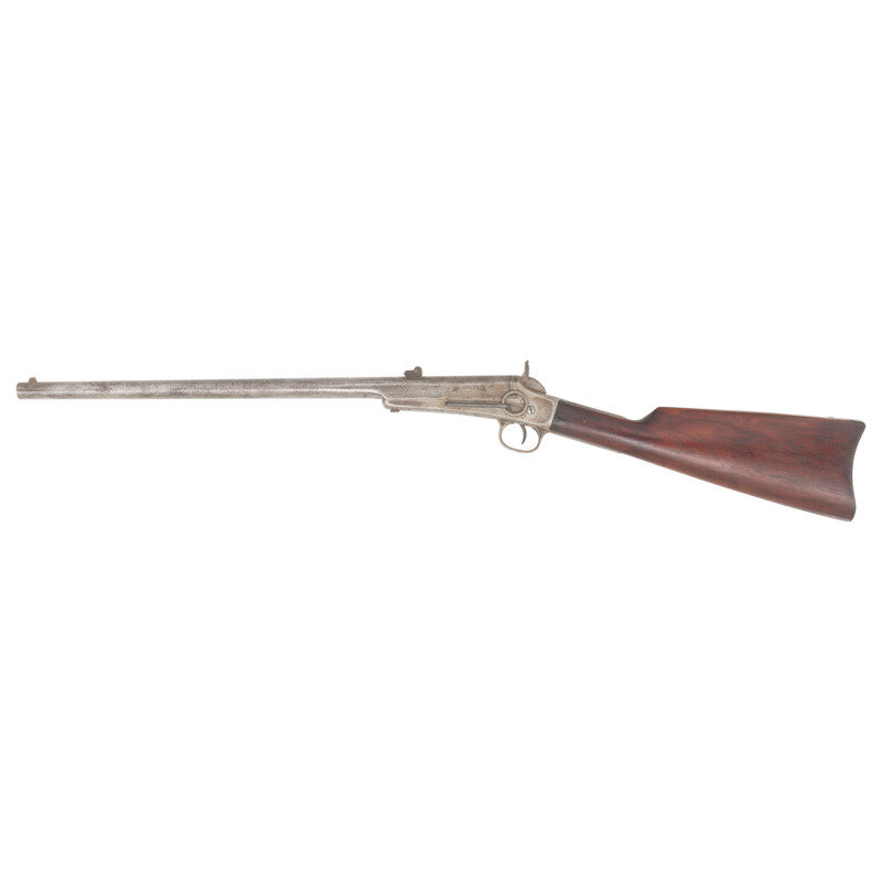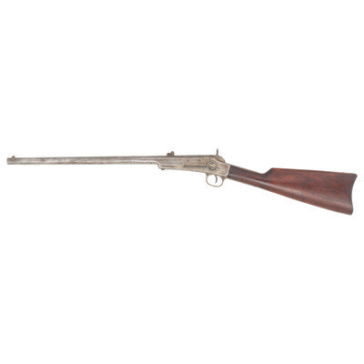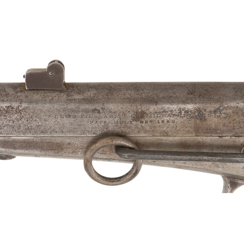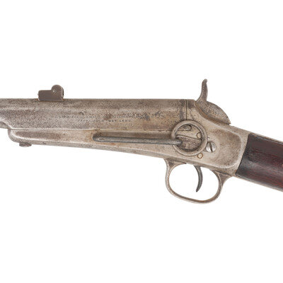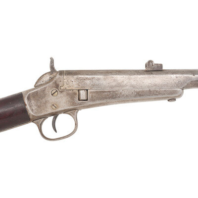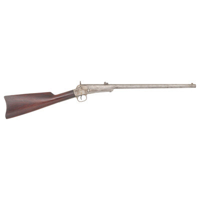 .44RF. 21" barrel. SN: 2175. Bright finish, iron furniture, walnut stock. Single shot swivel barrel breechloading carbine with L-leaf rear sight, fixed front sight blade, saddle bar and ring and manual extractor. Weak Lee Fire Arms Company markings on right of barrel. A rare example of the first of James Paris Lee's firearms designs to be manufactured in any quantity. {ANTIQUE}