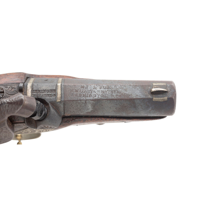 Galt & Brother was a Washington, DC based luxury items and "fancy goods" shop that was established in 1802, making it one of the oldest American jewelry companies. The firm sold a wide variety of high end and luxury items from jewelry, silver and watches to firearms. Interestingly they were repairing President Lincoln's pocket watch on the day the Civil War erupted and the jeweler engraved a secret message inside the watch commemorating the firing on Fort Sumter and thanking God for the US government. It is somewhat ironic that this same firm also sold pistols made by Henry Deringer, as it was one of Deringer's pistols that was used to assassinate the president some four years later. A rare and desirable retailer mark for a Deringer pistol. A brass tag commemorating the date of Lincoln's shooting, April 14, 1865 is attached to the triggerguard. {ANTIQUE}