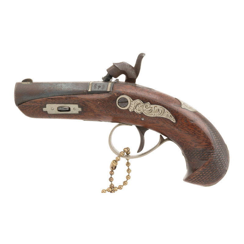 .40 caliber. 2.5" octagon to round barrel. NSN. Blued finish, German silver mountings, walnut stock with checkered bird's head butt. Single action, single shot percussion muzzleloading pocket pistol with German silver bands at breech German silver shield shaped thumb escutcheon, engraved pineapple finial triggerguard, fixed notch rear sight and dovetailed German silver blade front sight. Standard Henry Deringer lock and breech markings, including his starburst-P proof. Barrel additionally marked in three lines: MADE FOR/MW GALT & BROTHER/WASHINGTON D.C.