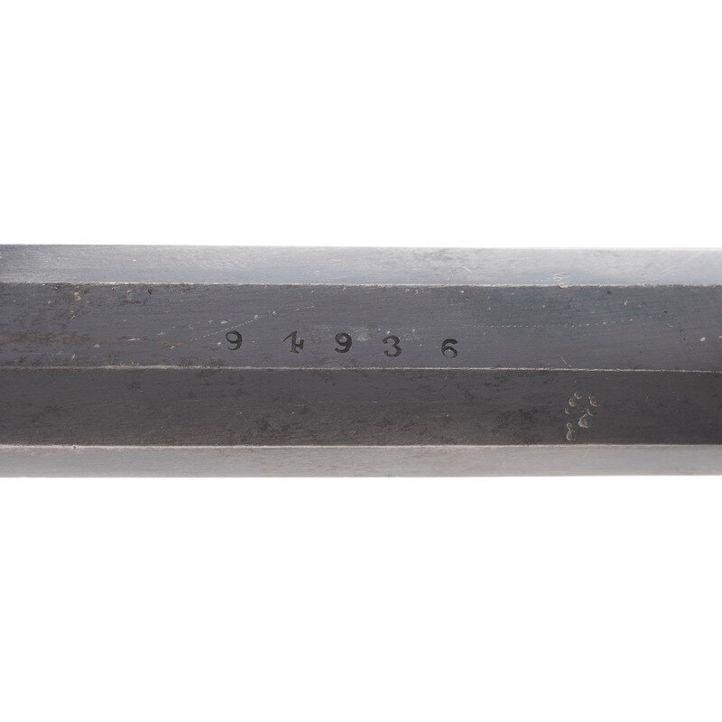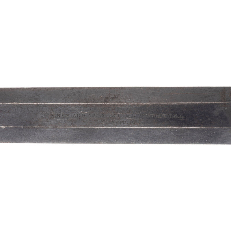 .44 caliber. 8" octagonal barrel. SN: 82358. Blued finish, brass triggerguard, smooth varnished walnut grips. Single action percussion revolver with unfluted six-chambered cylinder, frame notch rear sight and pinched blade front sight. Standard New Model barrel markings. Barrel serial number mismatched and is 94936. Grips are pencil numbered to the frame serial number 82358. Frame and cylinder are sub inspected but there are no inspections or cartouches on the grips, suggesting that this mixed number gun was likely built from parts for commercial sale from guns that did not pass inspection. {ANTIQUE}