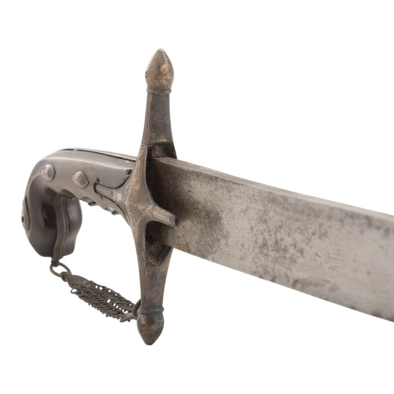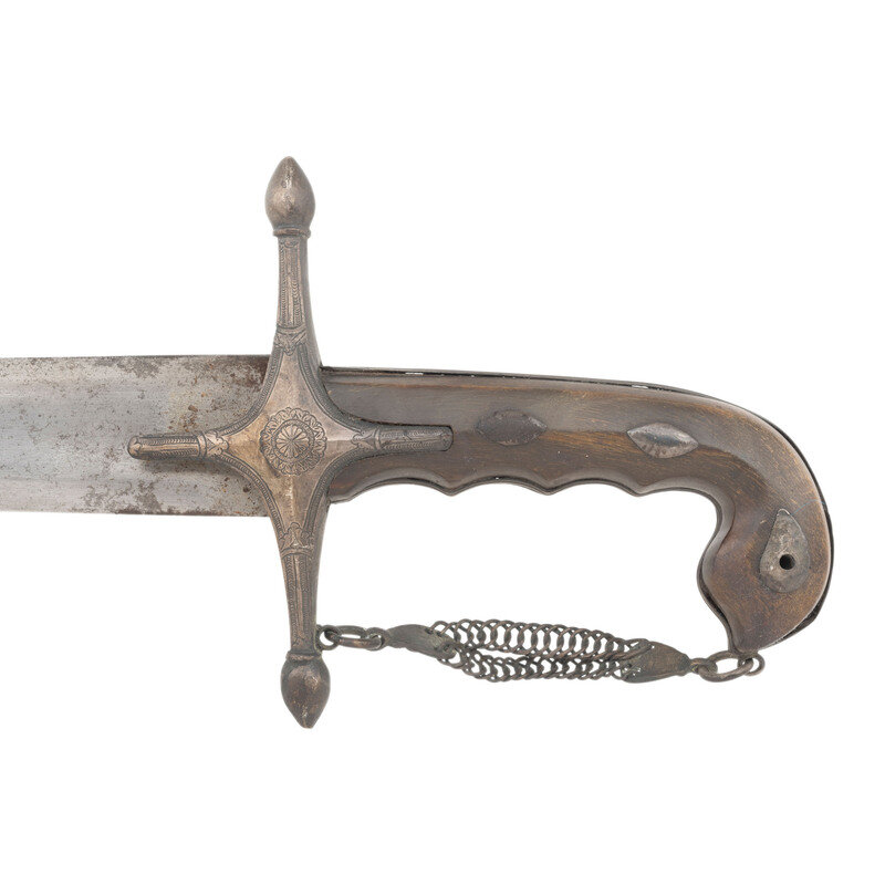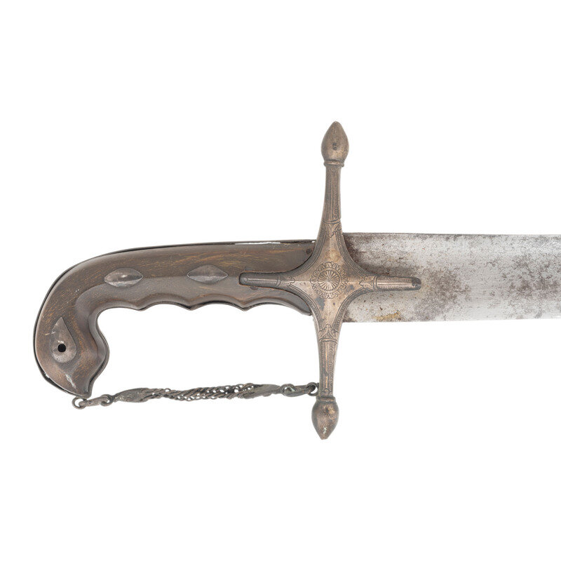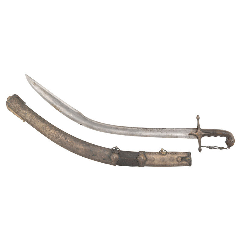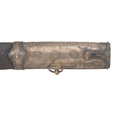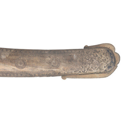 27.5" curved, single-edged traditional Kilij style blade, nominally 1.75" wide at the widest point. Overall length 33.125". 5.25" hilt of traditional Mamluk style with finger grooved horn grip scales. 6.5" cross guard with 1.5" langets. Hilt and guard appear to be of silver or possibly German silver or a similar non-ferrous metal white metal that will tarnish. Hilt with chain knuckle bow. Guard is delicately engraved with simple floral and geometric themes. Blade plain and unadorned. Wooden scabbard covered in metal of the same type that appears to have been used for the hilt and decorated with profuse amounts of well executed floral and geometric engraving. Scabbard with leather covering between the upper mountings.