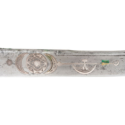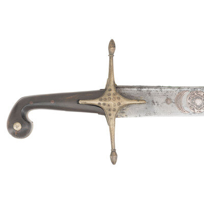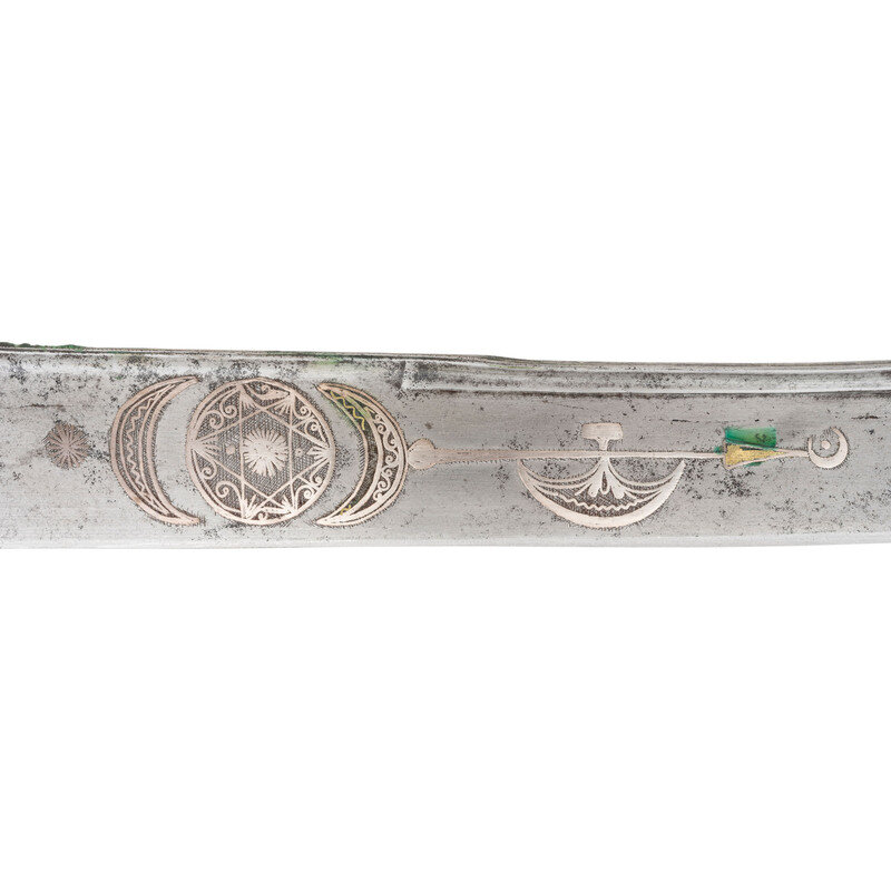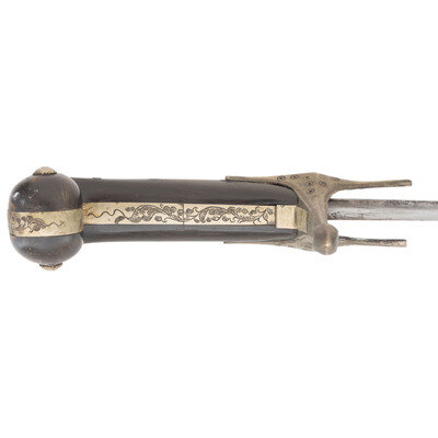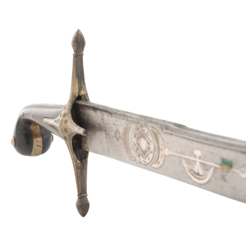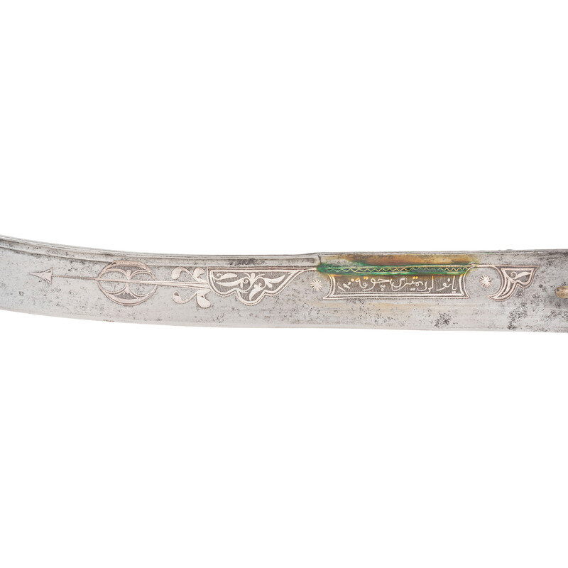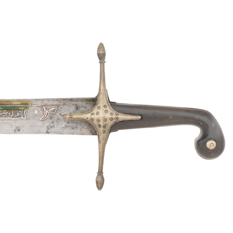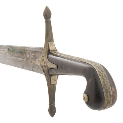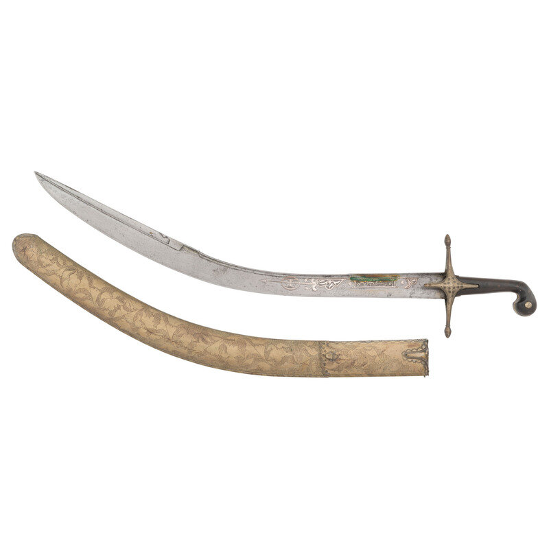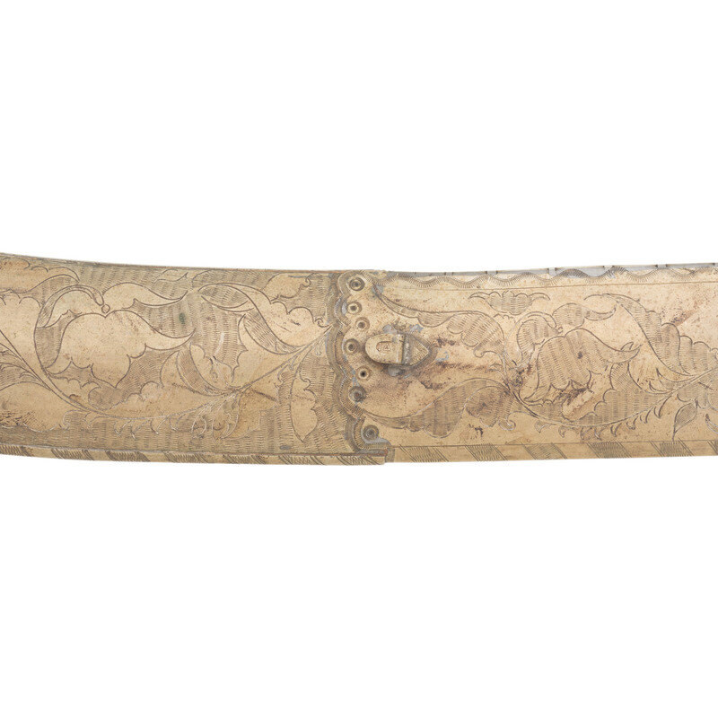 25.75" curved, single-edged traditional Kilij style blade, nominally 1.75" wide at the widest point. Overall length 31.25". 5.5" hilt of traditional Mamluk style with horn grip scales. 6.5" cross guard with 1.5" langets. Hilt and guard appear to be of German silver or a similar non-precious, non-ferrous metal. Both are engraved with decorative floral and geometric themes. Blade decorated with silver inlays in floral and marital motifs with a text box on the reverse of the blade that is filled with appears to be Arabic script. Wooden scabbard covered in metal of the same type that appears to have been used for the hilt and decorated with profuse amounts of floral engraving.