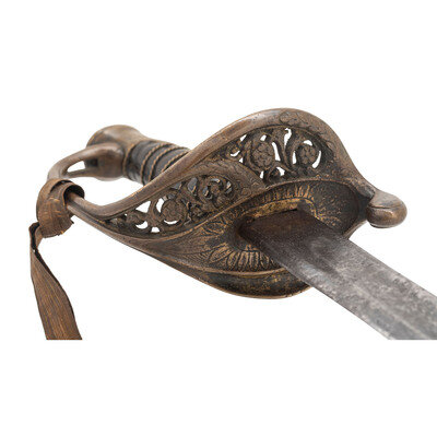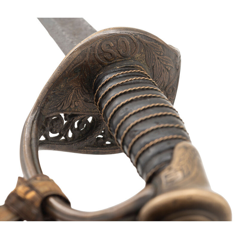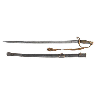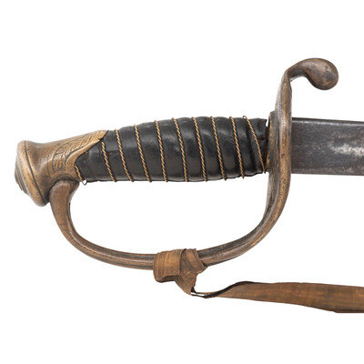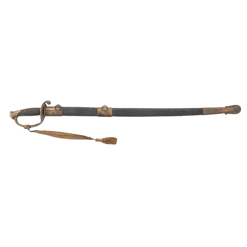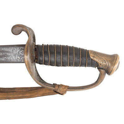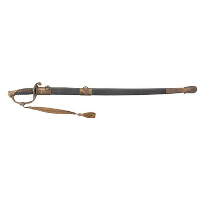 30.5" single edged spear point blade with 21" unstopped median fuller. Blade nominally 1.125" wide at ricasso. Overall length 36.25". 5.5" hilt with cast brass guard and knuckle bow with the typical Leech & Rigdon foliate motifs cast into the outer face of the guard and a CS in an oval cast into the inner face of the guard. Leather covered grooved wooden grip is ill fitting and loose with 10 wraps of twisted wire. The sword is accompanied by a brass mounted leather scabbard seamed up the rear with flat upper and middle mounts that appear to be replaced. Includes an old, added gold bullion sword knot.