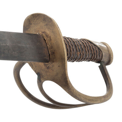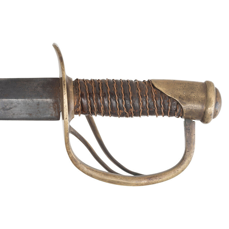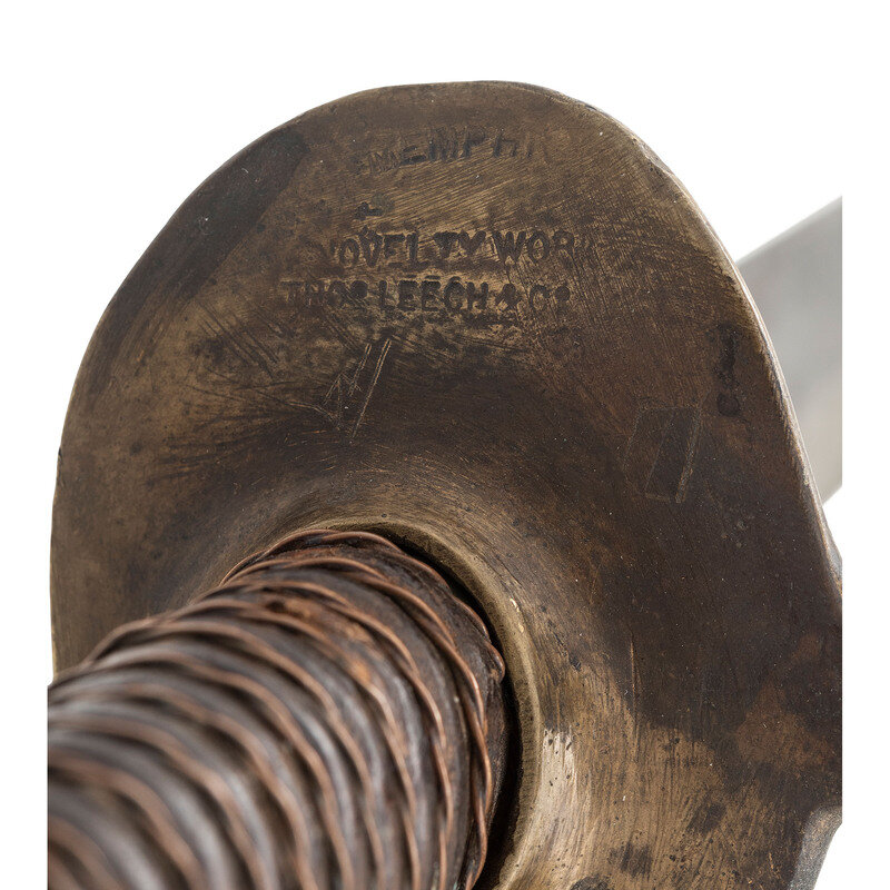 35.75" straight, double edged blade with prominent median ridge. Blade 1.45" wide at ricasso. Overall length 41.125". 5.5" hilt with cast brass two branch guard and knuckle bow with Phrygian helmet pommel cap. Wood grip with cord wrap and leather covering and 15 wraps of thick twisted copper wire. Upper inside face of guard crudely stamped MEMPHIS/NOVELTY WORKS/THOS LEECH & CO. The marking is mostly legible, although both ends of the stamping are weak. The sword is accompanied by a reproduction brass scabbard with brass suspension mounts and rings with the throat. A rare variant Leech & Rigdon saber.