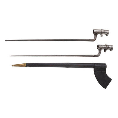 2) US M1859 Sharps Rifle Socket Bayonet weakly marked C&Co on left of socket. 18" blade, 3" socket, 21" in overall length. Muzzle diameter measures .817". Functional locking ring intact. Includes a US Pattern 1857 "No Rivet" scabbard that shows moderate wear.
