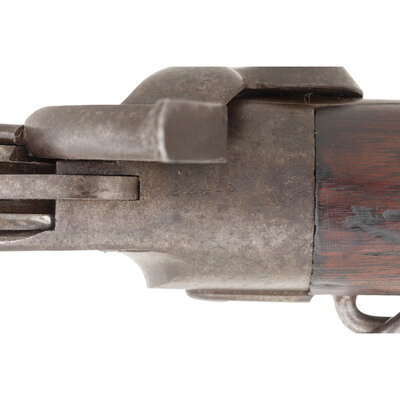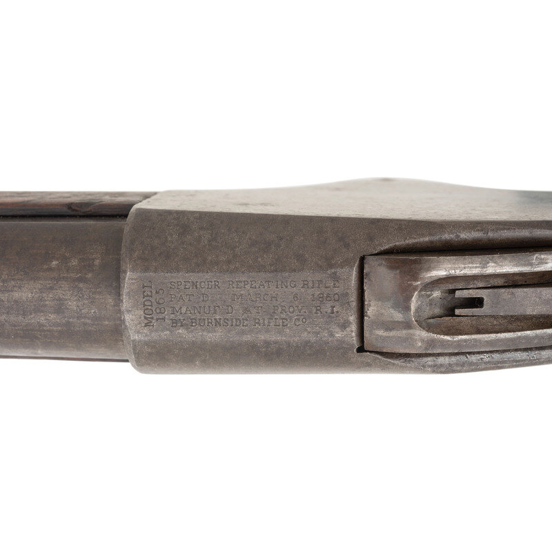 .50 Spencer. 20" round barrel secured by a single spring-retained barrel band. SN: 22419. Blued and color casehardened finish, smooth walnut stock and forend. Lever action manually cocked 7-shot repeating carbine fed from a tubular magazine in the butt, with folding ladder M1865 rear sight, blade front sight, correct grooved bottom Indian Wars era magazine follower tube, saddle bar and ring and sling swivel in toe. Standard Burnside Rifle Company markings on top of receiver. Two weak cartouches are present on the reverse wrist behind the sling bar plate. {ANTIQUE}