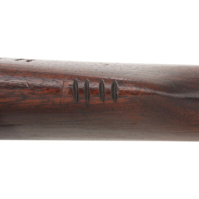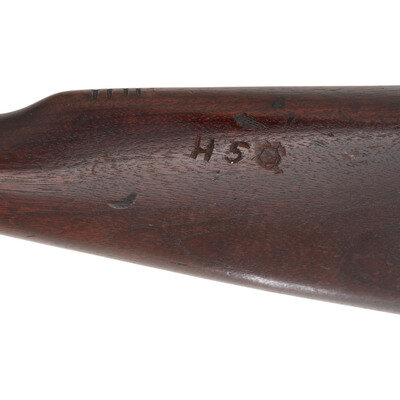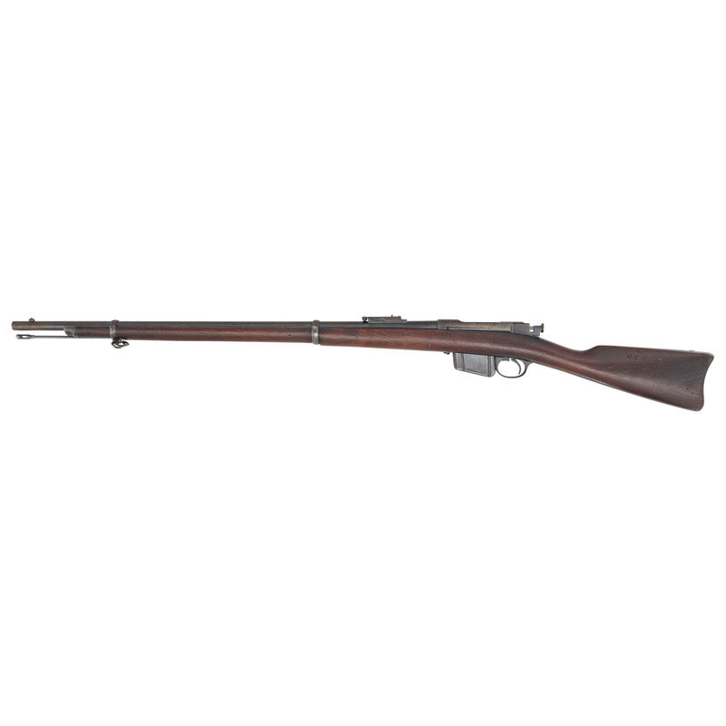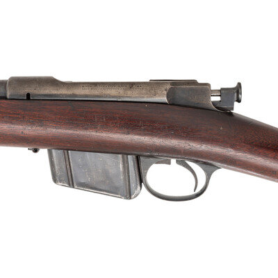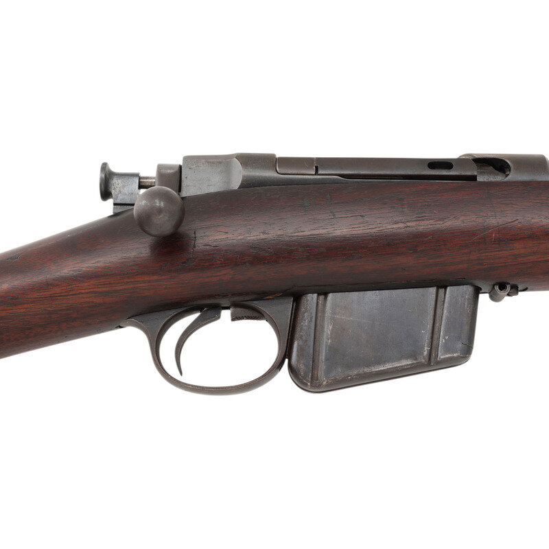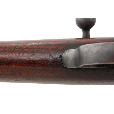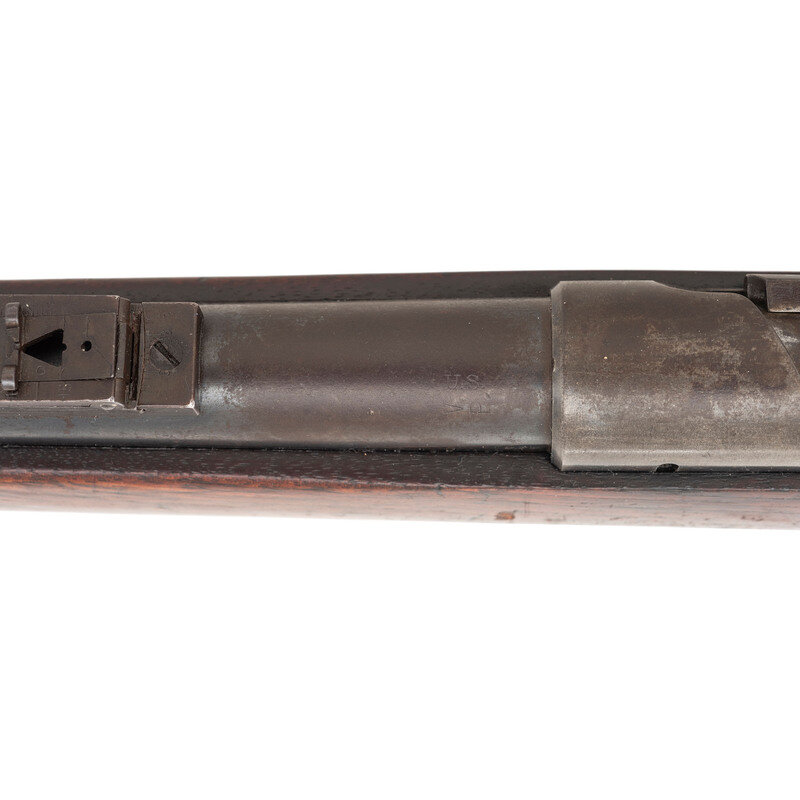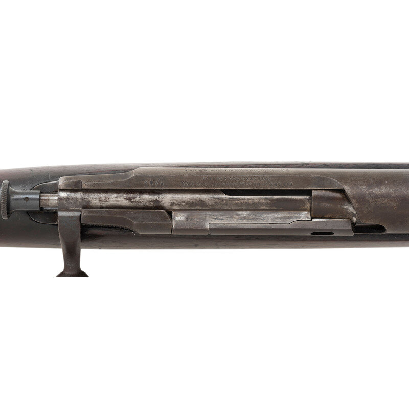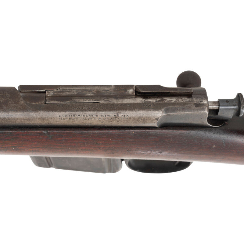 .45-70. 32.5" barrel secured by two rounded spring-retained barrel bands. SN: 9403. Blued finish, iron furniture, walnut stock. Magazine fed bolt action military rifle with incorrect M1884 Buffington rear sight, Barleycorn combination front sight and socket bayonet lug, sling and stacking swivel on upper band, missing the lower swivel. Top edge of receiver with two-line Lee Arms Company markings and reverse of receiver with E. Remington & Sons markings. Breech with US/VP and D.F.C. inspection marks. A weak block D.F.C. inspection is in the wood behind the triggerguard along with a weak {Circle-P} proof. Includes a cleaning rod and a single magazine. {ANTIQUE}