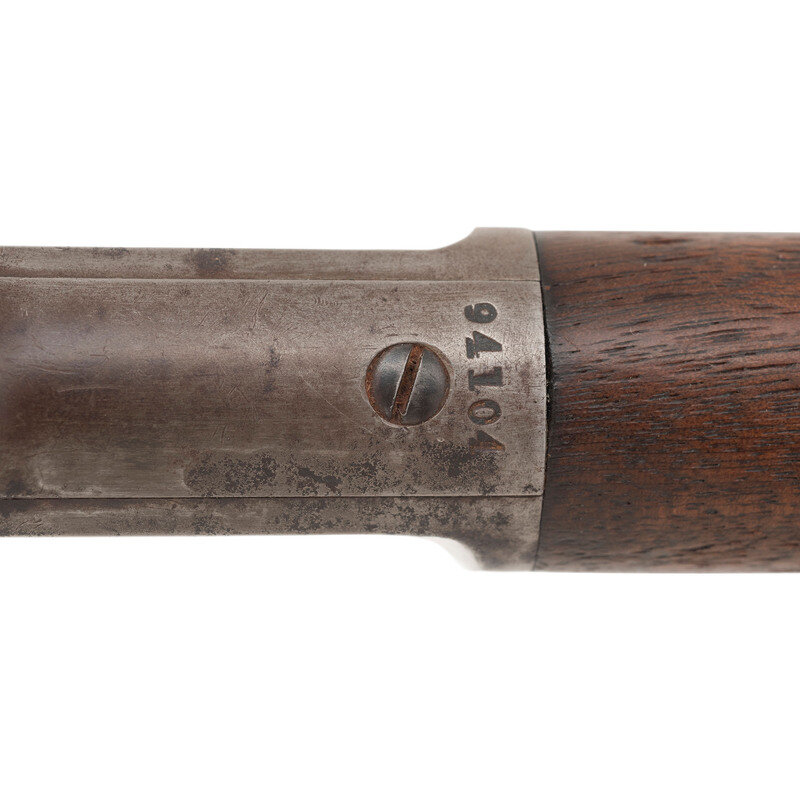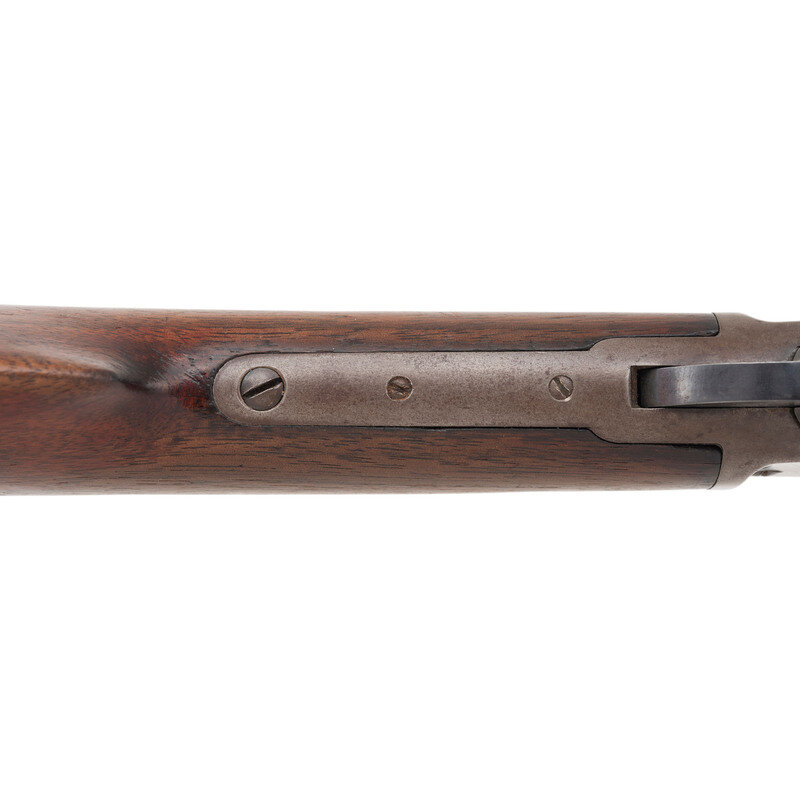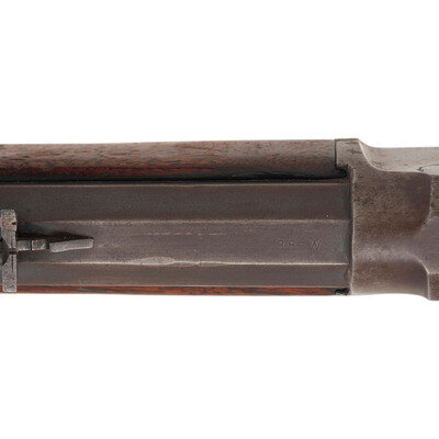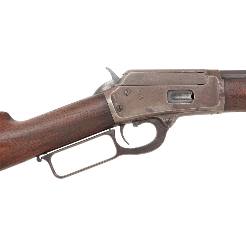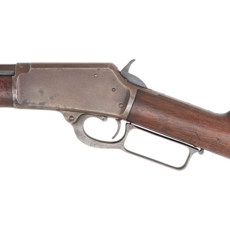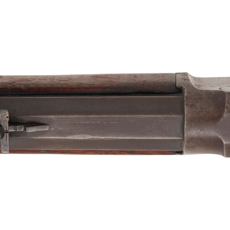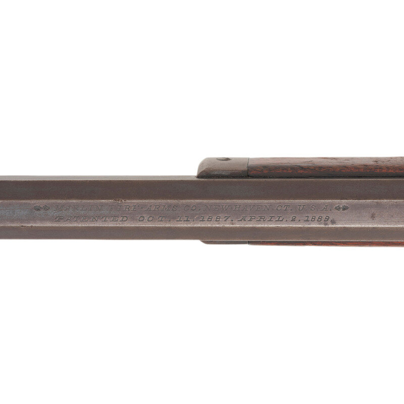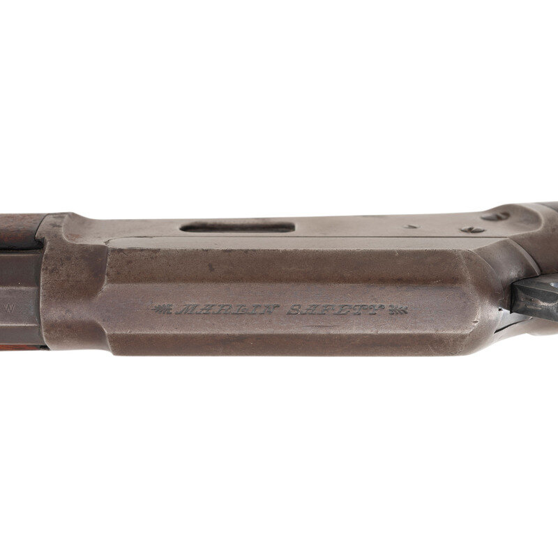 .38-40. 24" octagonal barrel with full length magazine. SN: 94104. Blued finish, smooth walnut stock with crescent buttplate and smooth forend. Lever action repeating tubular magazine fed rifle with elevation adjustable semi-buckhorn rear sight, and dovetailed Rocky Mountain blade front sight. Two line barrel address and patent markings with the last date being April 2, 1889, top of receiver marked MARLIN SAFETY. {ANTIQUE}