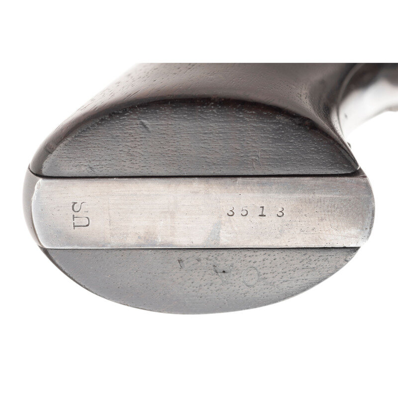 .45 S&W Schofield. 7" ribbed barrel. SN: 3315. Blued finish, color casehardened barrel latch, hammer and triggerguard, smooth walnut grips. Single action break top, automatic ejection revolver with a six-chambered fluted cylinder, rear sight notch in barrel catch and replaced rounded front sight blade with notch. Standard markings, matching numbers on butt, rear face of cylidner and inside the right grip. {ANTIQUE}