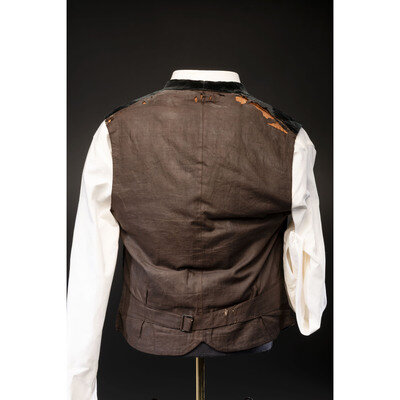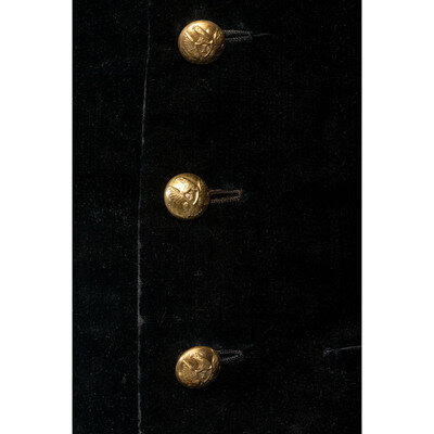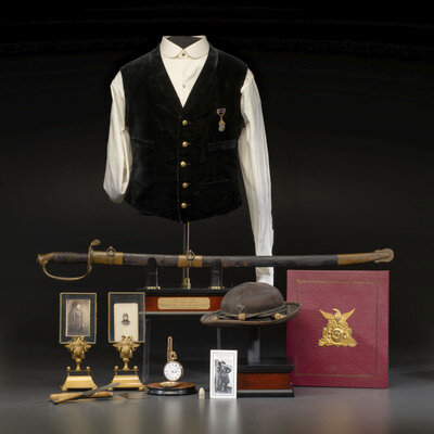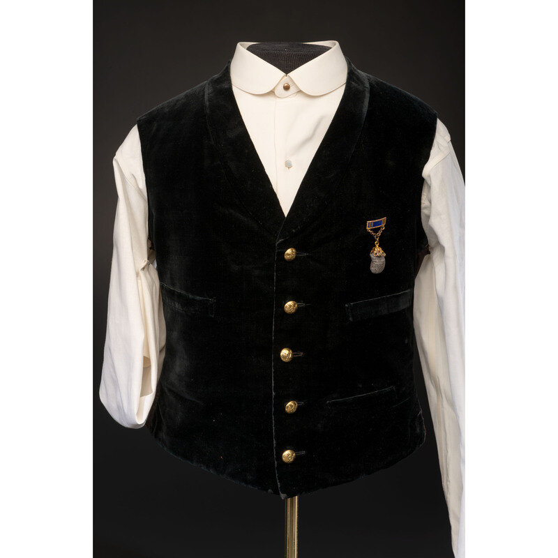 2) A civilian pattern black velvet waistcoat attributed to Zug with US general service cuff buttons, a decorative pin on the vest that purportedly has the bullet that took his arm attached to it. The waistcoat is displayed with a white shirt of a "period" pattern that is of much more recent manufacture.
