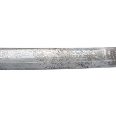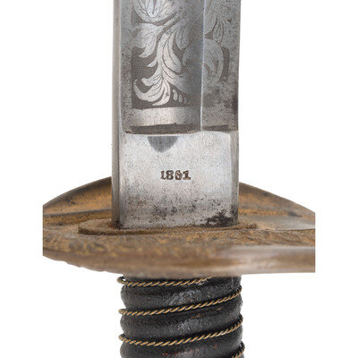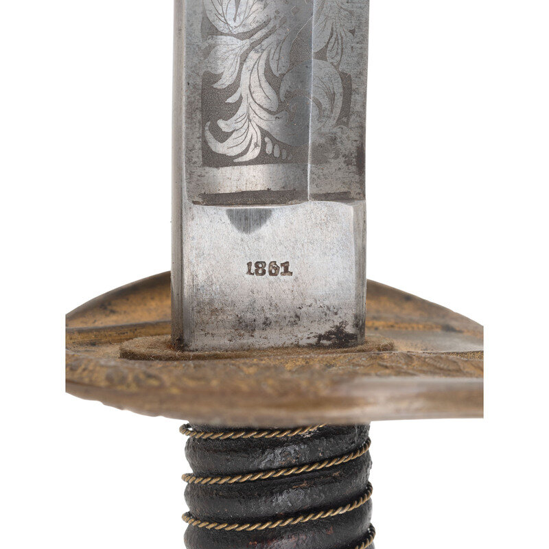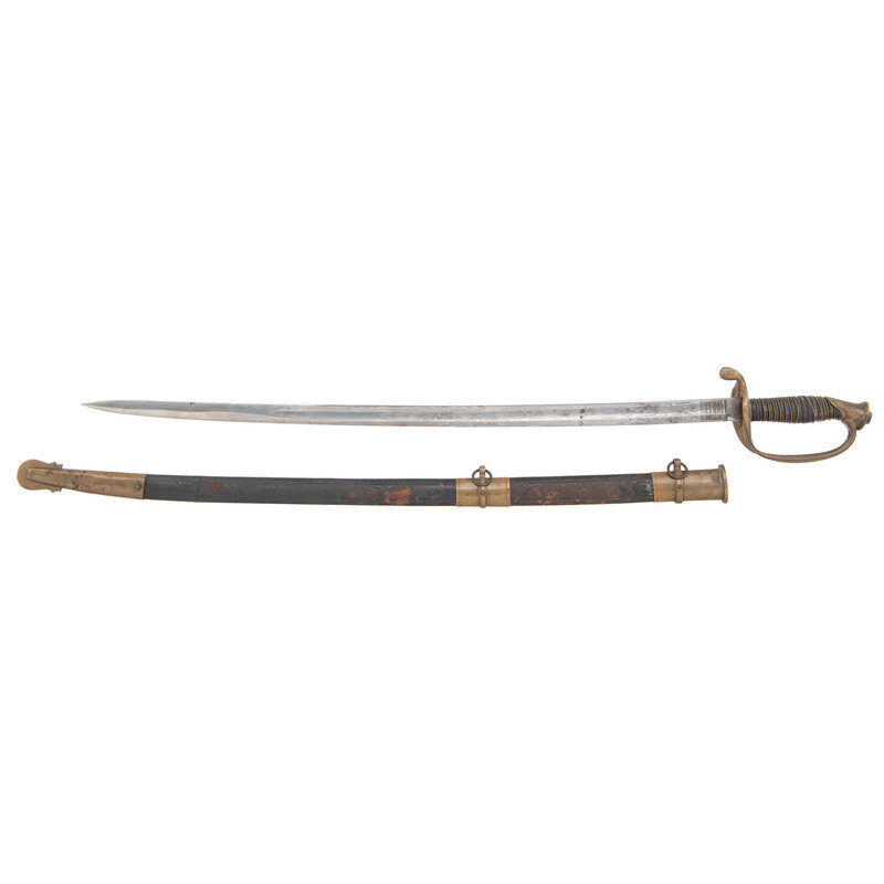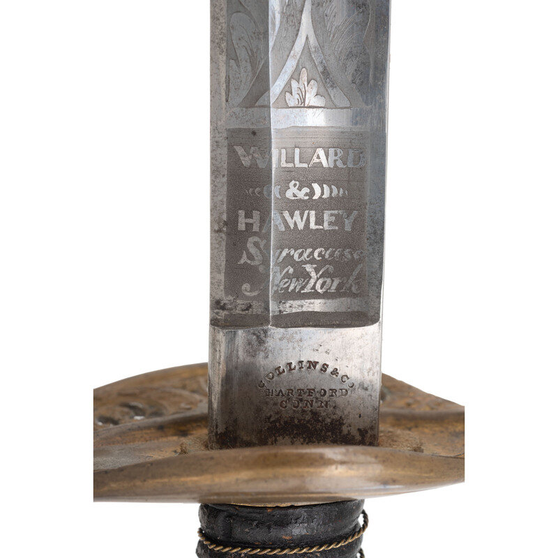 1) An etched blade Collins & Company US Model 1850 Foot Officer's Sword dated 1861 and retailer marked by Willard & Hawley of Syracuse, NY. The sword has a 30.75" single edges spear point blade with a 21" stopped median fuller. The sword is 36.75" in overall length with a 6" hilt. The cast brass guard is decorated with foliate themes and the leather covered grooved wood grip has 15 wraps of twisted wire. The sword is accompanied by a brass mounted leather scabbard.