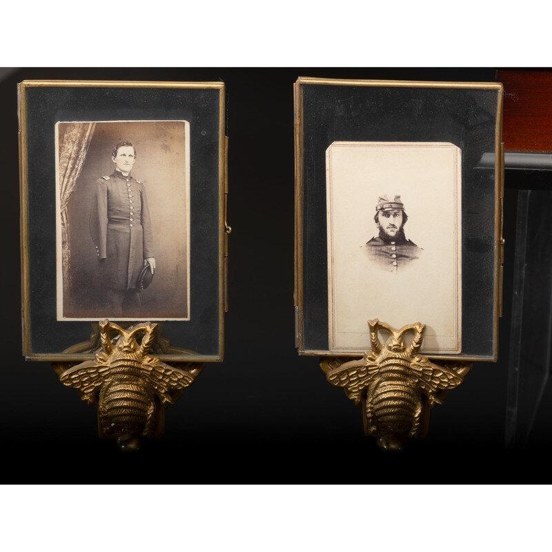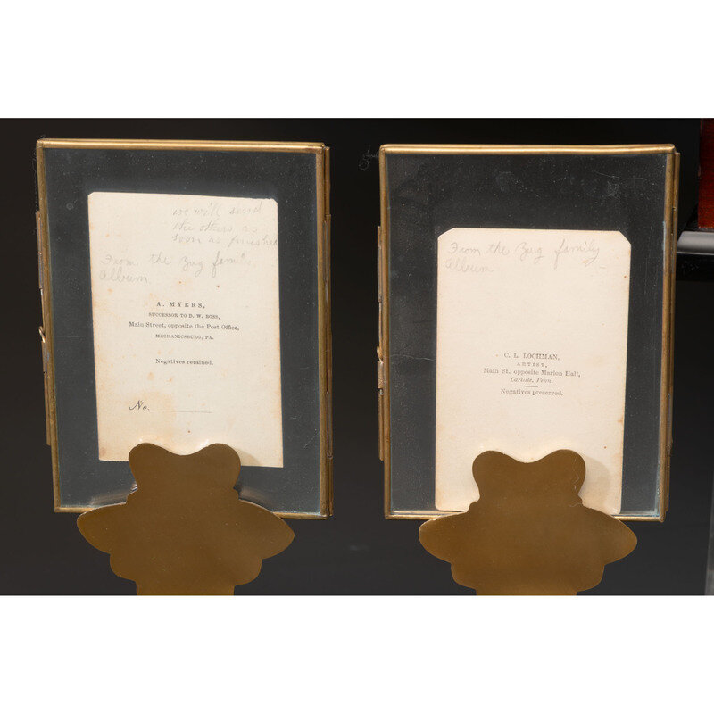 5) Two CDVs that are purportedly of Zug, in attractive brass 19th century display stands. The clean shaven image of Zug shows him in a single breasted officer's frock coat with his right arm missing and holding what appears to be the slouch hat in this grouping in his left hand. The other image of a bearded man does not appear to be the same person, although both images have pencil notations that the images came from the Zug family album. both images were published in a short article about Zug by Tom Gordon Jr in the November-December 1984 issue of Military Images Magazine, on page 12, a copy of which is included with the archive.
