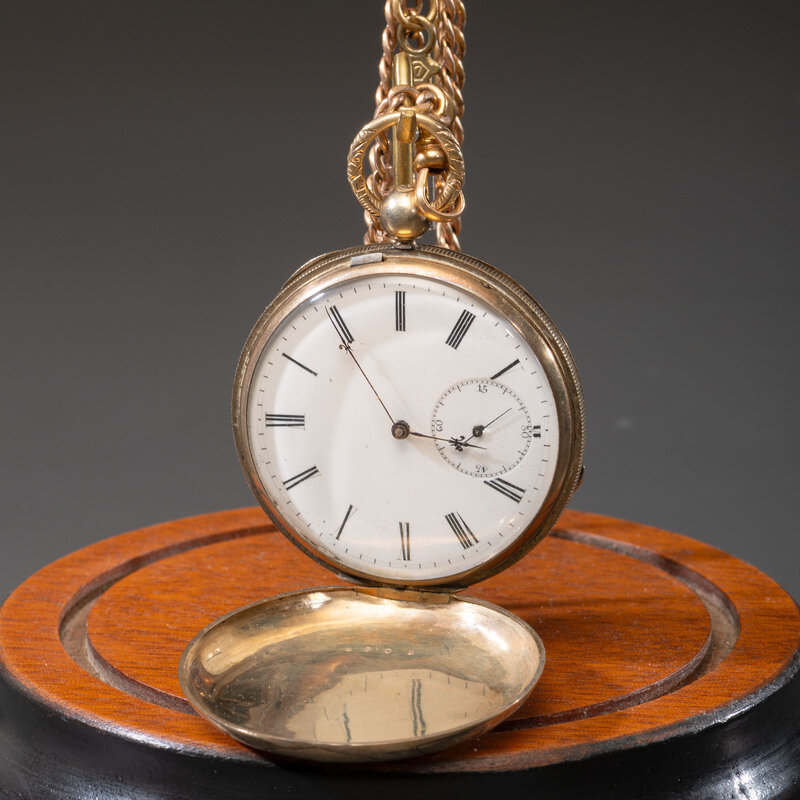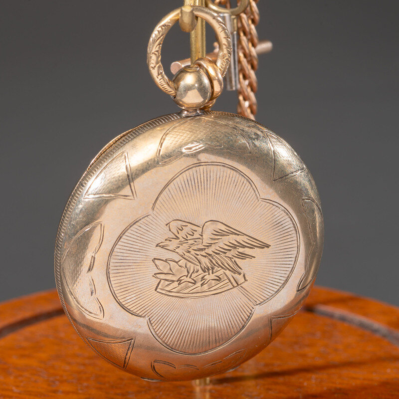 4) A Tobias key wind 13 jewel pocket watch in a rose gold full case with chain and key.