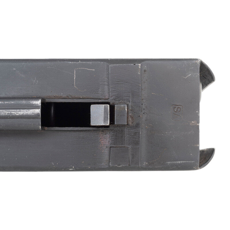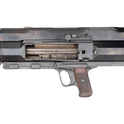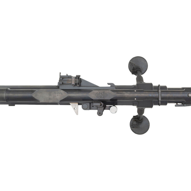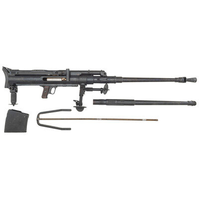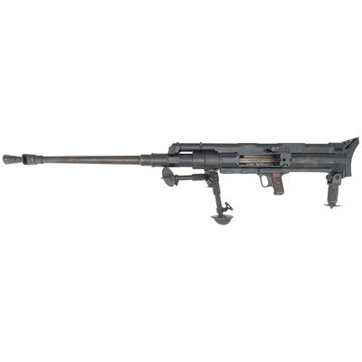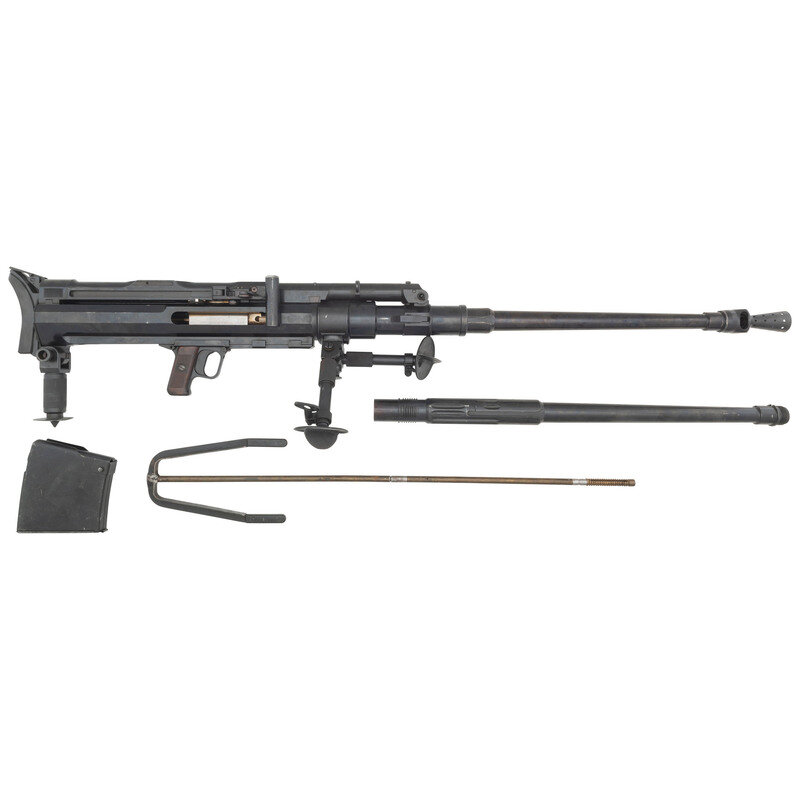20x105Bmm. 36.5" barrel length. SN: 4. Blued metal finish with polished bolt and horizontally serrated Bakelite grips mounting windage adjustable tangent rear leaf sight graduated from 0 to 1500 meters paired with a disc front sight. Recoil-operated semi-automatic Antitank rifle fed by detachable box magazines affixed to the left receiver, and mounting a muzzle brake and heavy rubber recoil pad. Item is registered as an S18-100 rifle with ATF, but appears to be the very similar S18-154 variant owing to the shorter length of the receiver forward of the ejection port. Rifle is sparsely marked, displaying the No. 4 serial number marking to the top of the receiver, and to other major parts, but some small parts have been mixed with other guns, including the number 11 to tangent sight slider. Further marks include the boxed SA mark indicating Finnish use and servicing, followed by the Bulgarian {Rampant Lion} coat of arms noted for its appearance on Antitank rifles exported to Finland. This marking most likely results from a substantial Bulgarian order for S18-100 rifles overlapping with the Finnish order. Item comes with a folding bipod, a spare barrel, the cleaning rod, and a green painted box stenciled INTERARMCO/301786/MADE IN SWITZERLAND. Also included are print-outs of assorted articles in German, Finnish, and English describing the service of these arms with Finland.