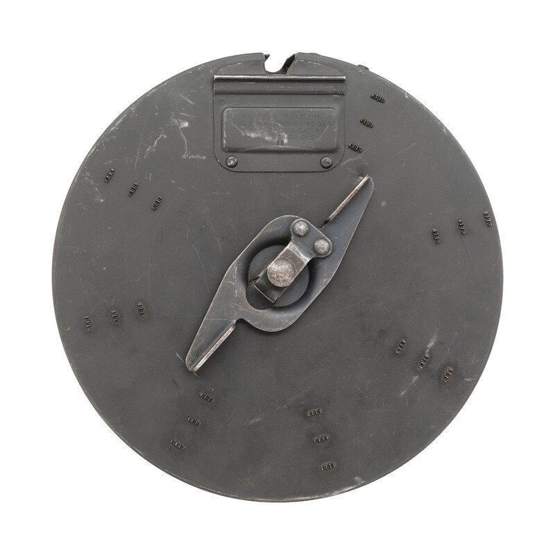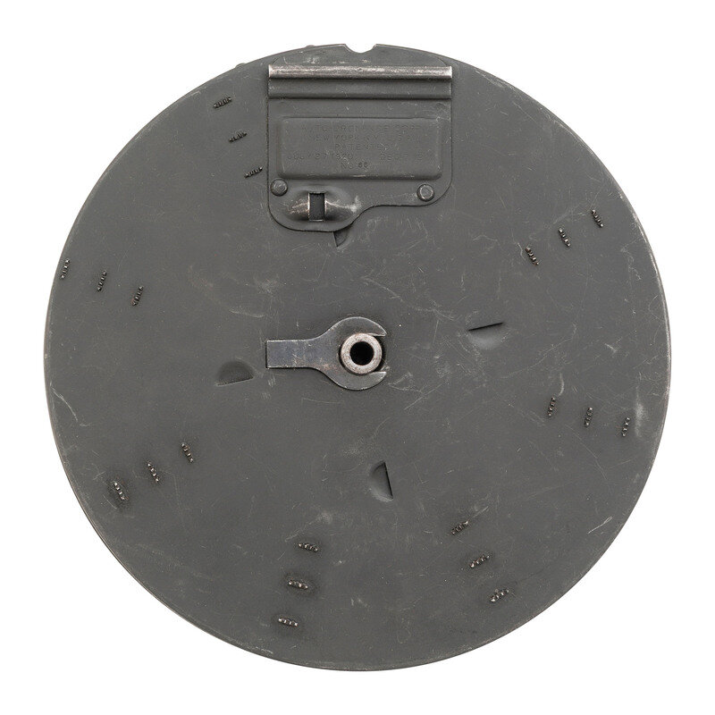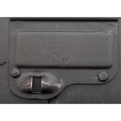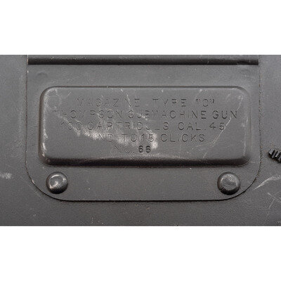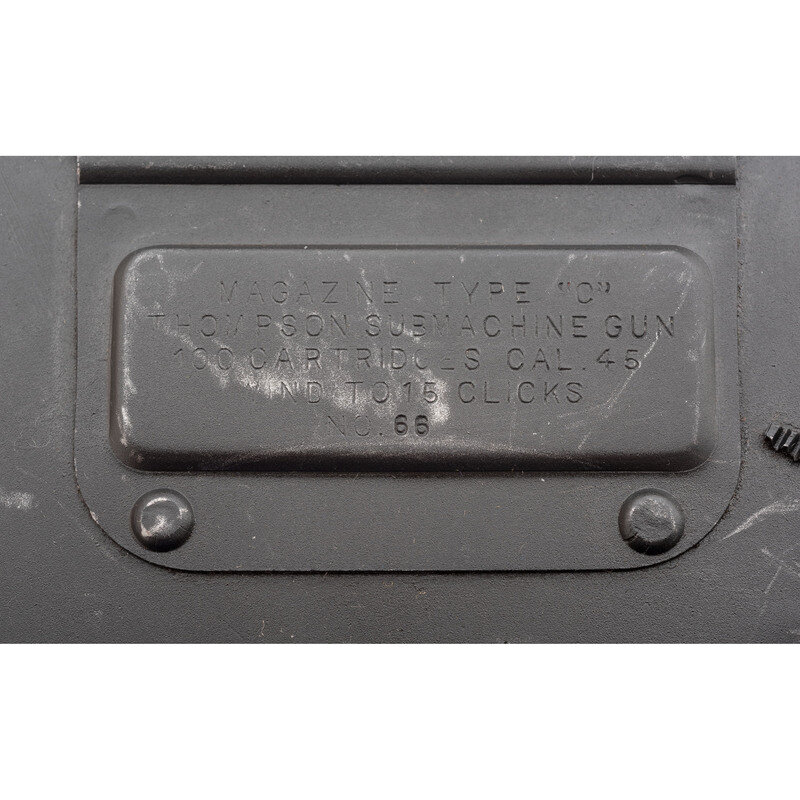8.5" x 2". Matte blued metal finish overall, pressed steel construction with correct Nickel rotor. Item displays matching serial numbers on front and backplate with maker mark to the front reading MAGAZINE TYPE "C"/THOMPSON SUBMACHINE GUN/100 CARTRIDGES CAL. 45/WIND TO 15 CLICKS/NO. 66. Back struck AUTO ORDNANCE CORP./NEW YORK N.Y., U.S.A./JULY 27 1920 DEC. 7 1920/NO. 66. A high condition example of an already rare magazine.