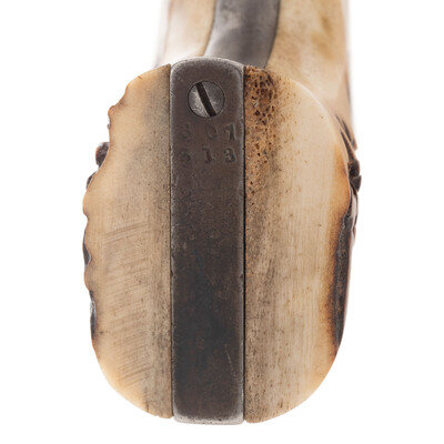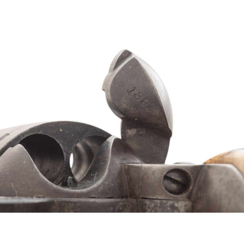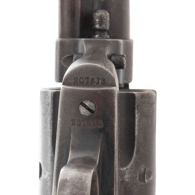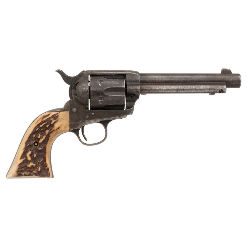 .38-40. 5.5" barrel. SN: 307613 (mfg. ca. 1908) Trace of blued finish transitioning to brown patina overall with staghorn grips, and further accompanied with Rampant Colt logo hard rubber grips and white synthetic Colt medallion grips. Single action six-shot loading gate revolver mounting front blade and topstrap rear notch sights. Left frame struck PAT. SEPT. 19 1871./JULY 2. 72. JAN. 19. 75. followed by circled {Rampant Colt} logo. Left barrel marked 38 W.C.F. with the top struck COLT'S PT. F.A. MFG. CO. HARTFORD CT. U.S.A. {C&R}