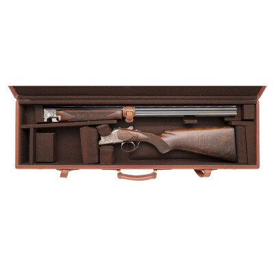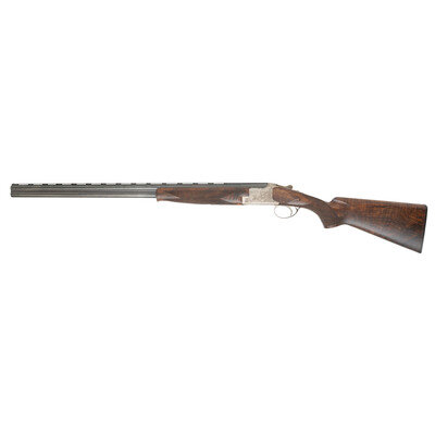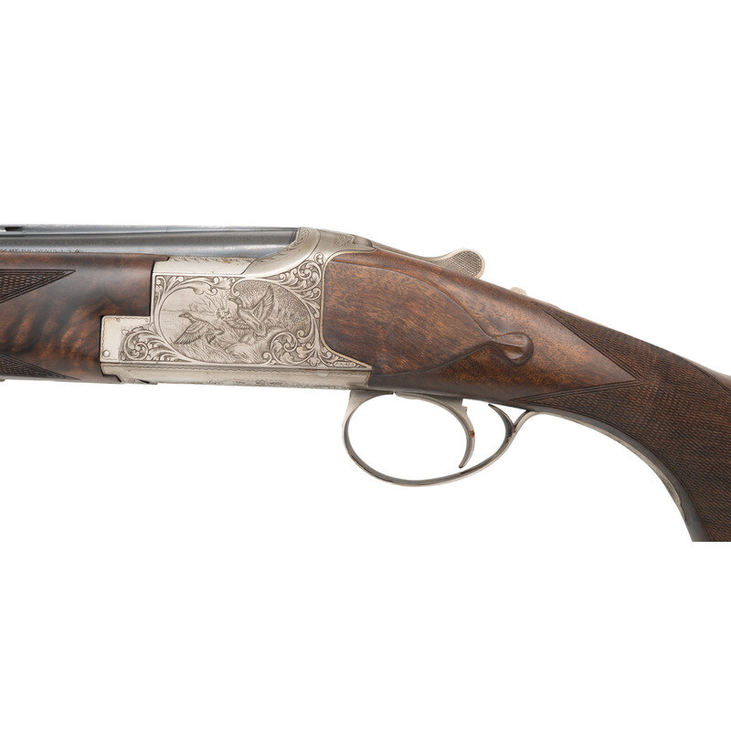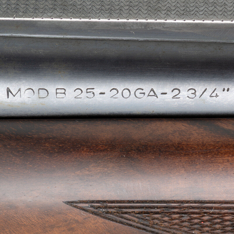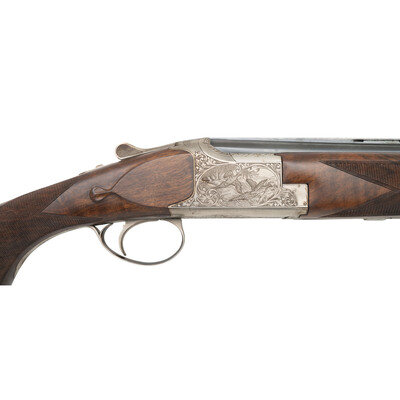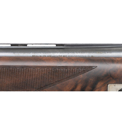 20 Gauge. 28" barrel length. SN: 324MM03460. 2.75" barrel length. Imp. Mod. over Imp. Cyl. Blued finish with French grey frame mounting bordered checkered walnut semi-pistol grip stock and schnabel forend mounting full length vented rib with single front bead sights. Double barrel over-under boxlock ejector shotgun featuring single trigger with safety-selector, and a BROWNING marked black synthetic buttplate. Frame is richly engraved with game scenes and floral scrollwork on a beaded ground, with C2G engraving grade marking struck into the lower frame. Maker mark to left barrel reads BROWNING ARMS COMPANY MORGAN, UTAH & MONTREAL P.Q./MADE IN BELGIUM BY BROWNING S.A. with the right barrel marked MOD B 25-220 GA- 2 3/4". Left barrels display choke markings of * for upper barrel and ** for lower. Item comes with a leather bound travel case with brown velvet lining and gold BROWNING brand to the interior lid. 14.5" length of pull. 1.5" droop to comb. 2.375" drop to heel. {MODERN}