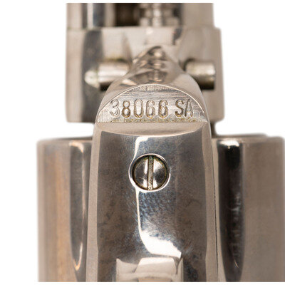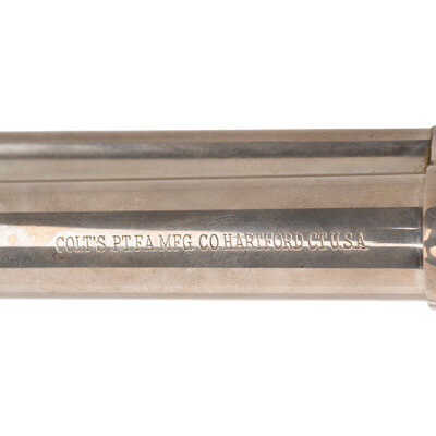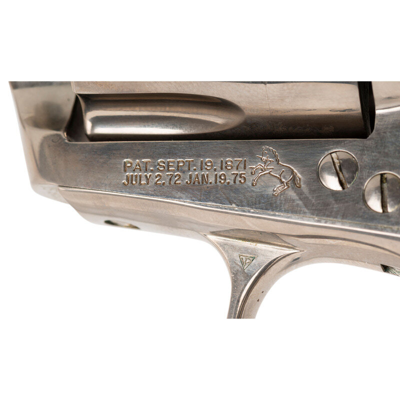 .45 Long Colt. 4.75" barrel length. SN: 38066SA. (Mfg. ca 1963). Nickel plated finish overall mounting {Rampant Colt} logo marked checked black synthetic grips. Single action six-shot loading gate revolver mounting topstrap rear notch and front blade sights. Left frame is marked PAT. SEPT. 19. 1971/JULY 2. 72. JAN. 19. 75 followed by {Rampant Colt} logo. Left barrel marked COLT SINGLE ACTION ARMY .45 with the left triggerguard marked with Colt's VP monogram proof, and a V stamp. Top of the triggerguard is marked COLT'S PT. F.A. MFG. CO. HARTFORD CT. U.S.A. Rear cylinder struck with the {Rampant Colt} logo, with the face showing the last three digits of the serial number. {C&R}