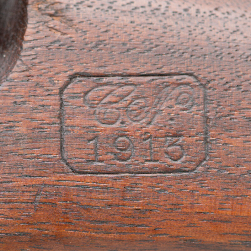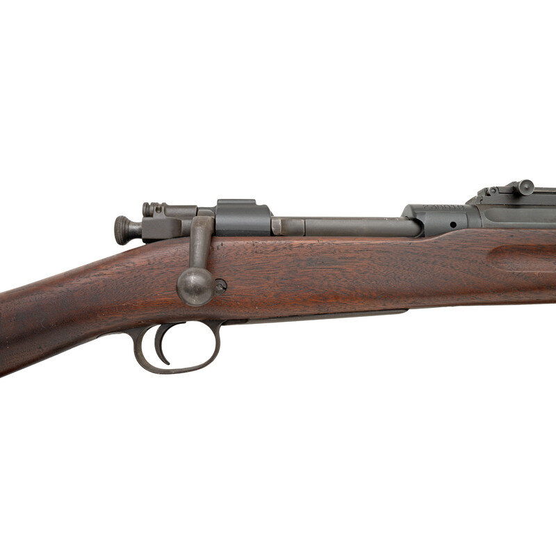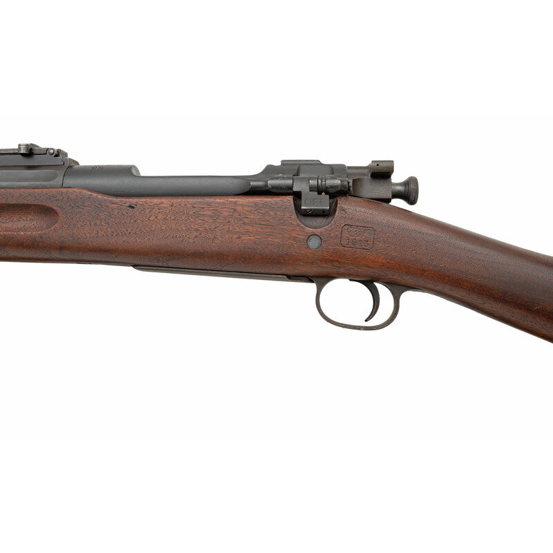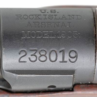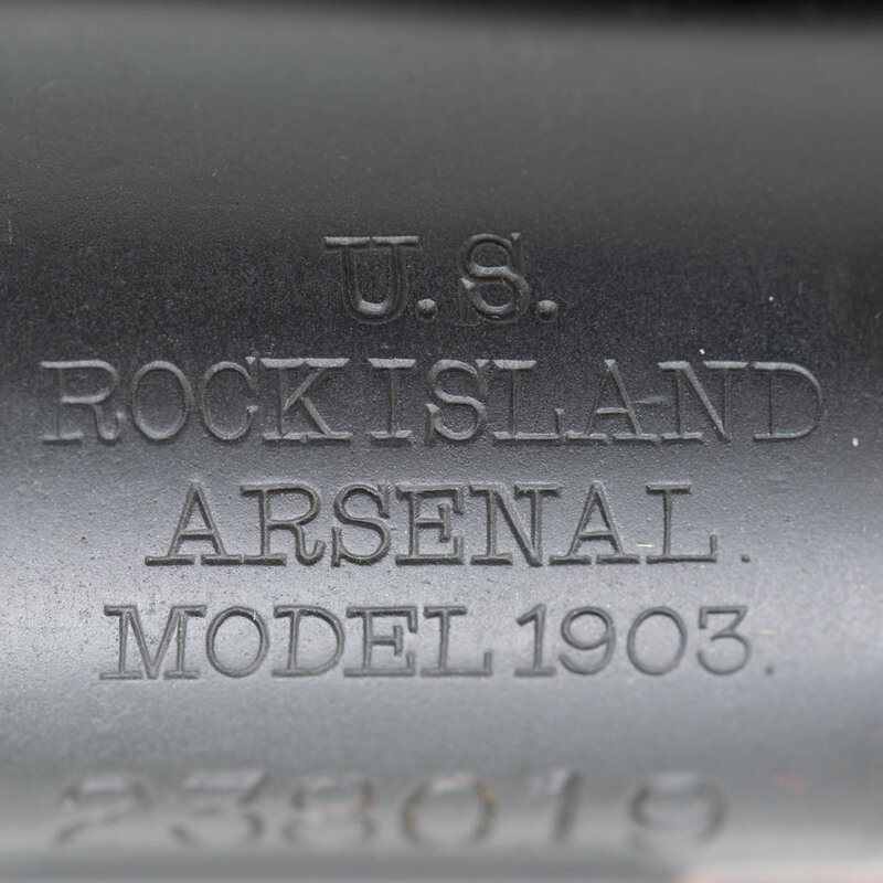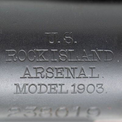 .30-60. 24" barrel length. SN: 238019. Parkerized arsenal refinish with blued small parts and walnut straight wrist S-Stock and full length upper handguard. Bolt action internal magazine fed repeating rifle charged with stripper clips. Rifle mounts pinned front blade and ladder rear notch sights. Receiver marking reads U.S./ROCK ISLAND/ARSENAL./MODEL 1903 and barrel date is struck RIA/{Ordnance Bomb}/8-13. Bolt handle is struck R10. Flat buttplate without checkering and void of tools. Stock shows a circle P to wrist below a struck 3, with left wrist showing C.N./1913 cartouche of inspector Conrad Nelson, correct of Rock Island rifles. Forward end of the stock displays an S stamp. Rifle mounts a Pattern of 1907 leather sling. {C&R}
