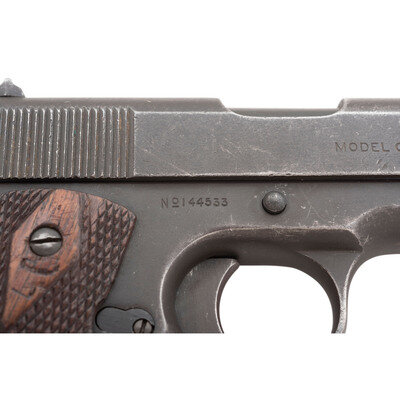 .45 ACP. 5" barrel length. SN: 144533. (Mfg. ca 1917) Parkerized metal refinish mounting half-moon front blade and rear notch sights with walnut double diamond checkered grips. Short-recoil operated single action autoloading pistol fed by detachable single stack magazines. Left slide struck with the patent mark PATENTED APR. 20. 1897. SEPT. 9. 1902./DEC. 191. 1905. FEB. 14. 1911. AUG. 19. 1913 followed by the address mark COLT'S PT. F.A. MFG. CO./HARTFORD, CT. U.S.A., with the {Rampant Colt} logo marked behind the cocking serrations. Right slide reads MODEL OF 1911. U.S. ARMY. Left frame is marked UNITED STATES PROPERTY with the right showing the serial number only. Item features a flat mainspring housing with lanyard loop, wide spur hammer, and frame without relief cuts. Barrel is Parkerized replacement marked T in front of the lug, with the bushing blued and likewise replaced. Comes with a blued two-tone magazine without lanyard loop. {C&R}
