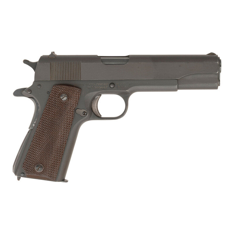 .45 ACP. 5" barrel length. SN: 1050442. Parkerized arsenal refinish with checkered Keyes fiber grips mounting standard military pattern sights. Short recoil operated single action autoloading pistol fed by detachable single stack magazines. Left slide shows the USS monogram followed by two-line legend reading U.S. & S. CO./SWISSVALE, PA. U.S.A. Right frame struck UNITED STATES PROPERTY followed by M 1911 A1 U.S. ARMY. Left frame shows the circled R.C.D. mark of inspector Robert C. Downie. Right frame additionally struck with an RIA arsenal stamp below the model mark, and FK initials of Frank Krack below the serial number, these two marks indicating the pistol was rearsenaled in Rock Island after the end of World War II. {Ordnance Bomb} to right frame behind trigger. P to the top of the slide and M to left slide behind cocking serrations. Interior of the left panel shows the K within Star logo of the Keyes company. Barrel is struck P on the left lug and HS on the right, indicating it was made by High Standard. Comes with an unmarked full blued magazine. {C&R}