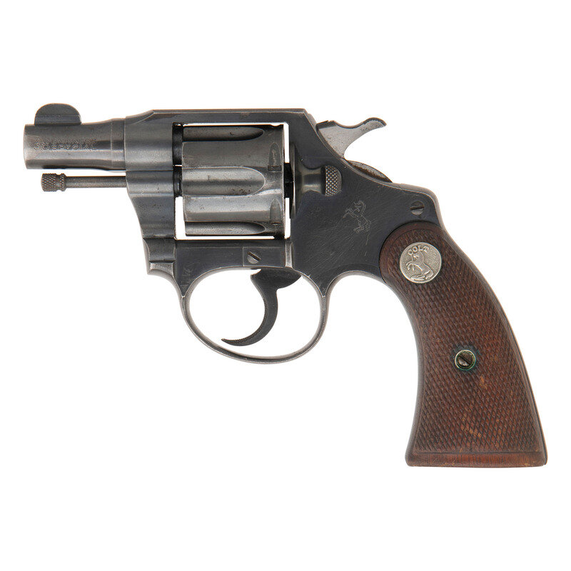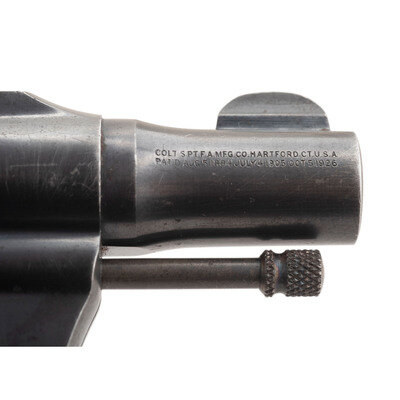 .38 Special. 2" barrel length. SN: 361919. (Mfg. Ca 1933) Blued metal finish with polished hammer flanks mounting checkered walnut Colt medallion grips. Double action six-shot hand ejector revolver mounting topstrap notch and half-moon front blade sights. Left barrel is struck .38 BANKERS/SPECIAL, with the right barrel showing a two-line address and patent mark reading COLT'S PT. F.A. MFG. CO. HARTFORD CT. U.S.A./PAT'D AUG 5. 1884. JULY 4 1905. OCT. 5. 1926. The left sideplate shows a {Rampant Colt} logo, while the left triggerguard is struck with Colt's VP monogram proof marking. A serial number search in Colt's database indicates this item left the factory as a Banker's Special. {C&R}