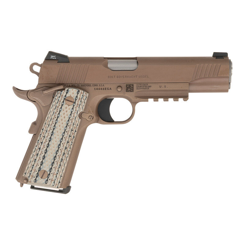 .45 ACP. 5" barrel length. SN: 14446EGA. Decobond and Ion Bond brown finish with textured G10 grip panels and NOVAK sights with triple dot tritium inserts. Short-recoil operated single action autoloading pistol fed by detachable single stack magazines. Right frame shows standard single line COLT address mark followed by QR code marking and model data reading (17V)1362/(1P)M1070CQBP/(S)14446EGA. The right frame is struck U.S. above the accessory rail Right slide marked COLT GOVERNMENT MODEL with the left marked COLT {Three Stars} M45A1. Further features include: extended beavertail grip safety, extended ambidexterous slide stop, flat grooved mainspring housing with lanyard loop, high cut frame below triggerguard, front and rear cocking serrations, skeletonized Commander hammer, matte finished National Match barrel, and a matte barrel bushing and recoil spring plug. Item comes in its original blue synthetic COLT branded hard case with accessories including: a total of two WILSON COMBAT magazines, cable lock in package, and the owner's manual. {MODERN}