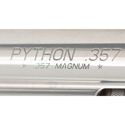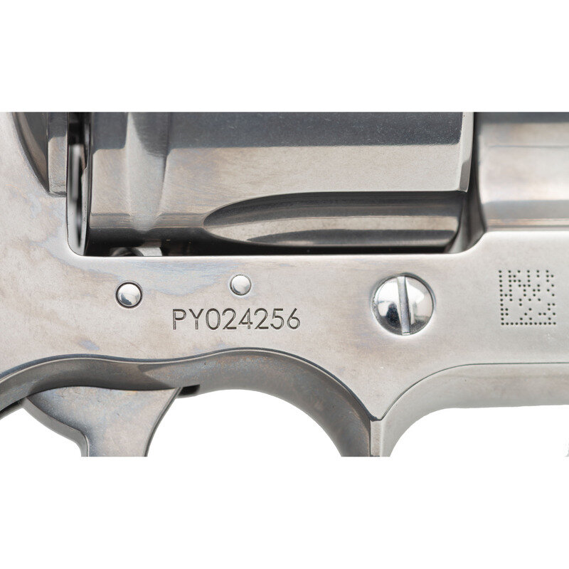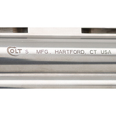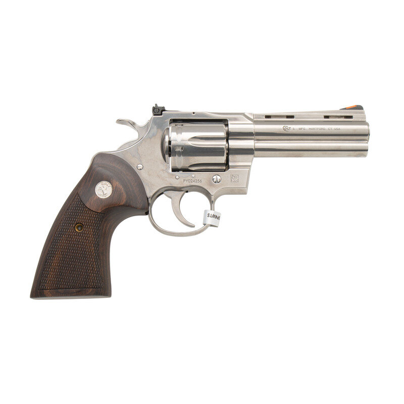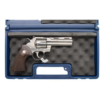 .357 Magnum. 4.25" barrel length. SN: PY024256. Polished stainless steel finish with matte hammer and trigger mounting adjustable rear notch and red plastic insert front ramp sights, and Colt medallion checkered laminated wood grips. Double action six-shot hand ejector revolver with full length vented barrel rib, and full length underlug. Standard make and model markings. Comes in original blue synthetic hard case with owner's manual and cable lock in package. {MODERN}