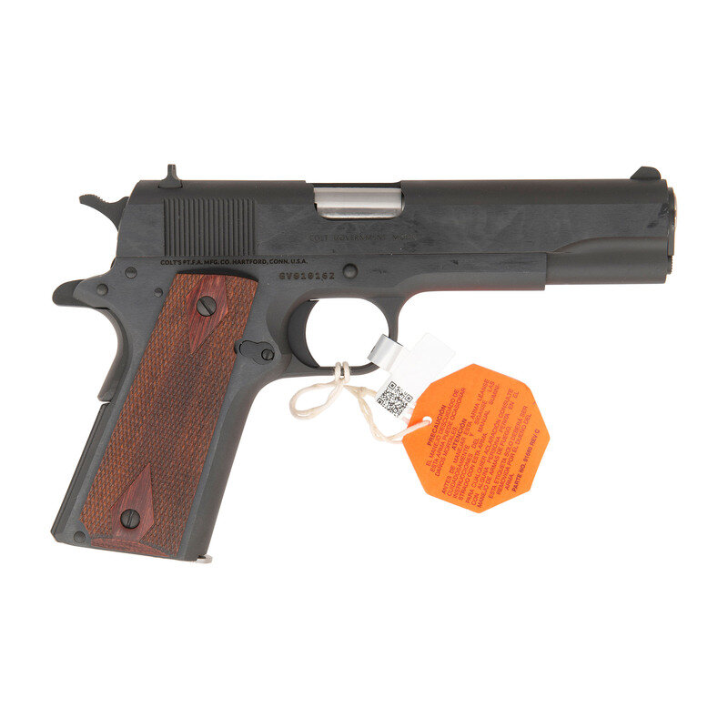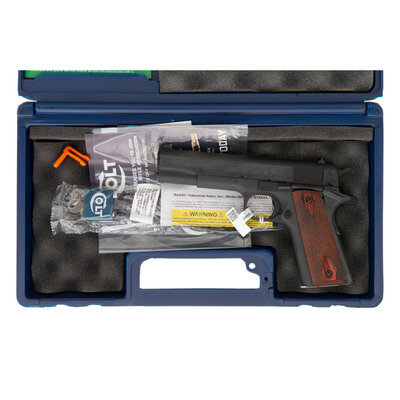 .38 Super. 5" barrel length. SN: GV010162. Blued metal finish with polished barrel mounting diamond checkered laminated wood grips. Short-recoil operated single action autoloading pistol fed by detachable single stack magazines and mounting standard military pattern sights. Item features a flat and vertically serrated mainspring housing, vertically serrated trigger, and standard components overall. Item shows standard Colt manufacturer and model markings. Comes in original blue synthetic hard case with cable lock in package, and the owner's manual. {MODERN}