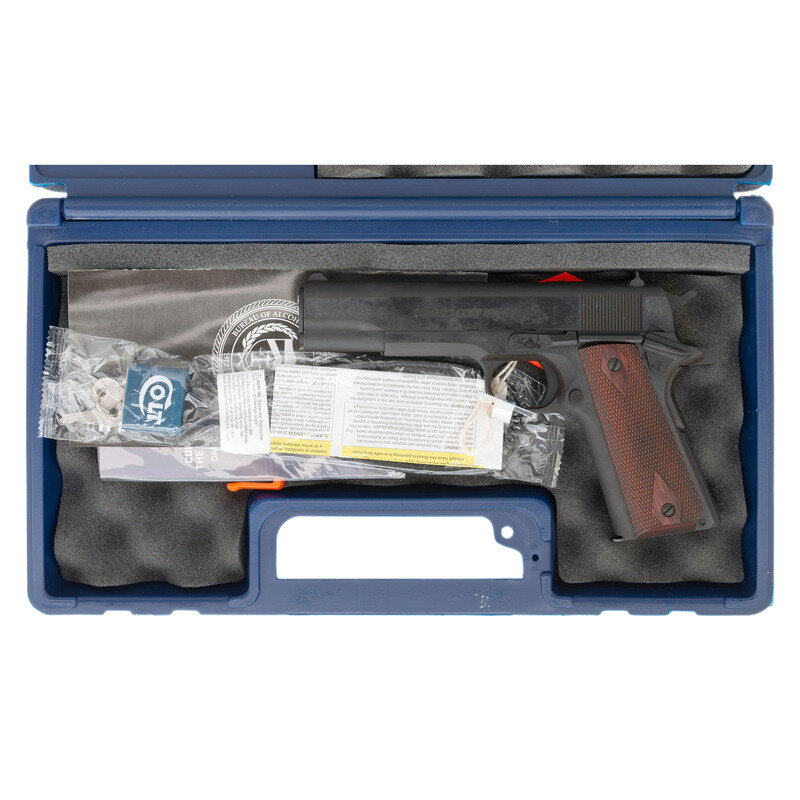 .45 ACP. 5" barrel length. SN: GV212949. Polished blued finish to flats with matte rounds mounting diamond checkered Cocobolo grips with Military style sights. Single action short recoil operated autoloading pistol fed by detachable single stack magazines. Standard markings include GOVERNMENT MODEL marks to left and right slide followed by {Rampant Colt} logo, with Colt's VP monogram proof to left triggerguard. Item features a flat mainspring housing, vertically grooved trigger, and brushed finish National Match barrel. Comes in original COLT marked blue synthetic hard case with cable lock and owner's manual. {MODERN}