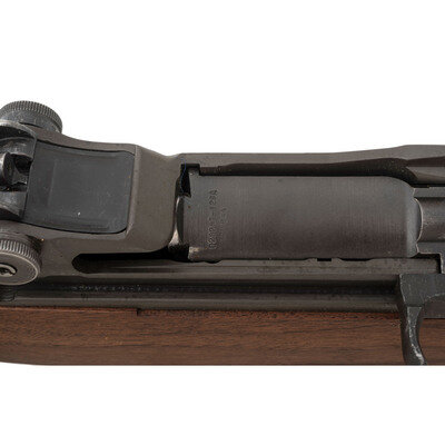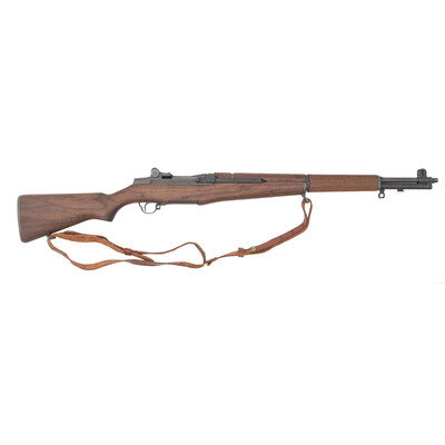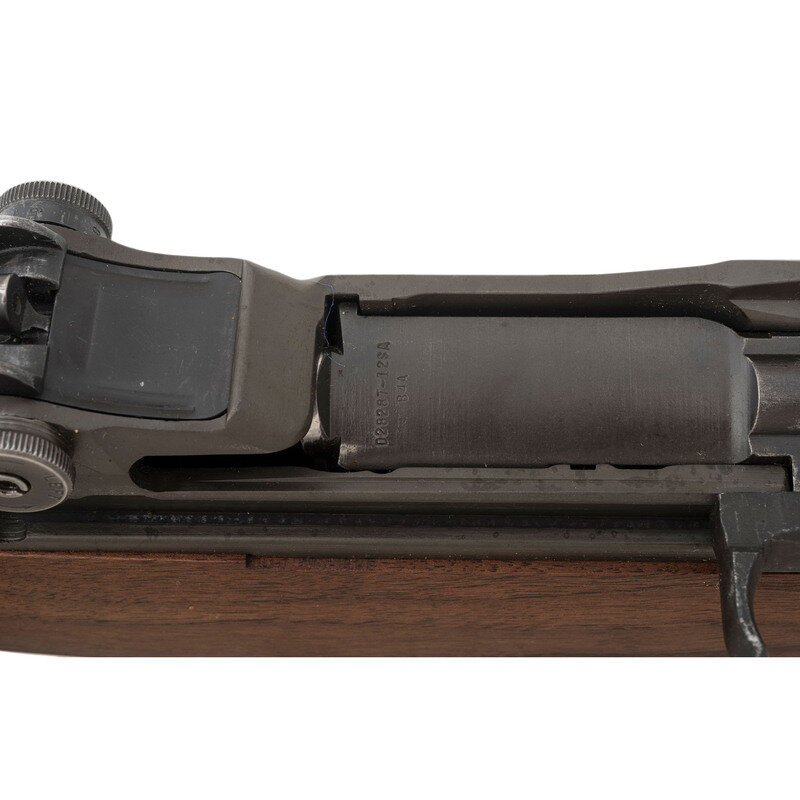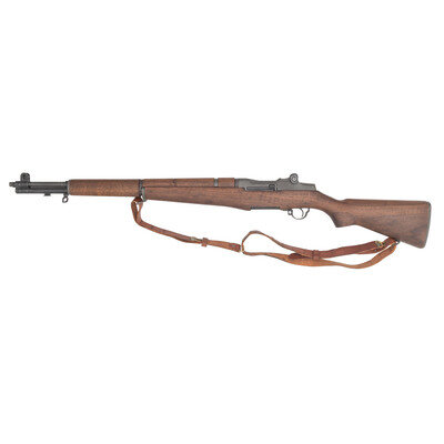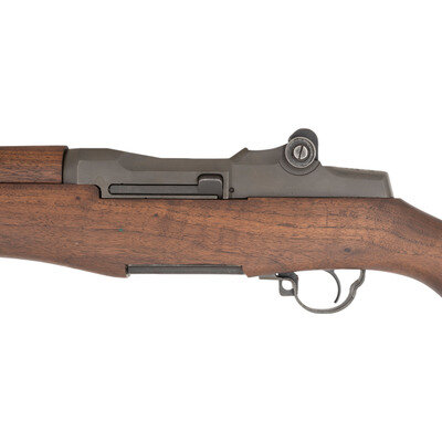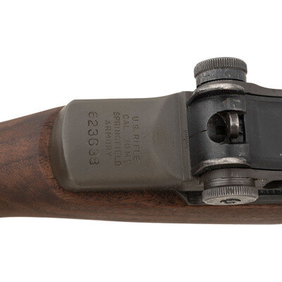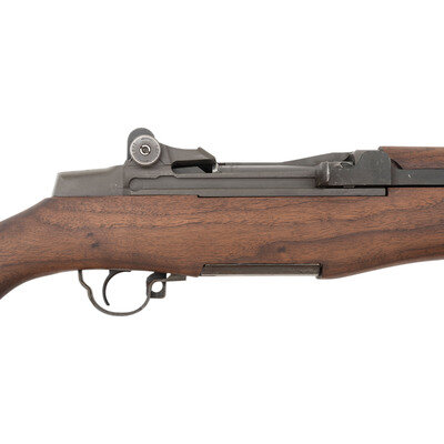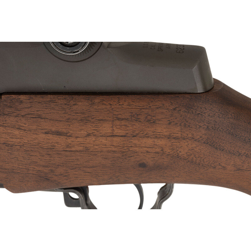 .30-06. 24" barrel length. SN: 623638. Parkerized arsenal refinish with CMP replacement walnut semi-pistol grip stock mounting T105 pattern sights. Long stroke piston driven gas operated rifle fed by an internal magazine charged with en bloc clips. Receiver serial number dates to May 1942 production, with the rifle having been updated after the end of World War II. Rifle mounts a relief cut operating rod showing a clipped drawing number, indicating it was modified at the arsenal. Barrel dated S-A-5-50, indicating it was made in May, 1950 by Springfield Armory. Left stock is struck with the CMP stamp, with no circle P to wrist. Mounts a leather sling. {C&R}