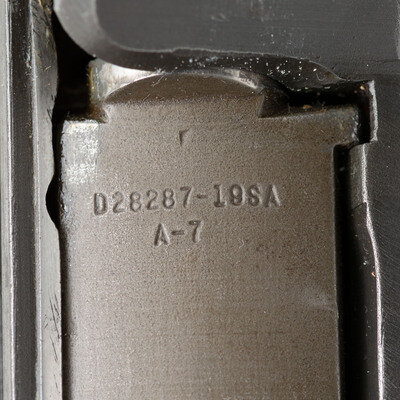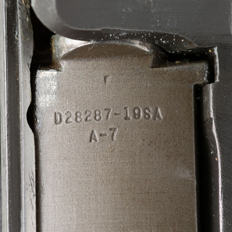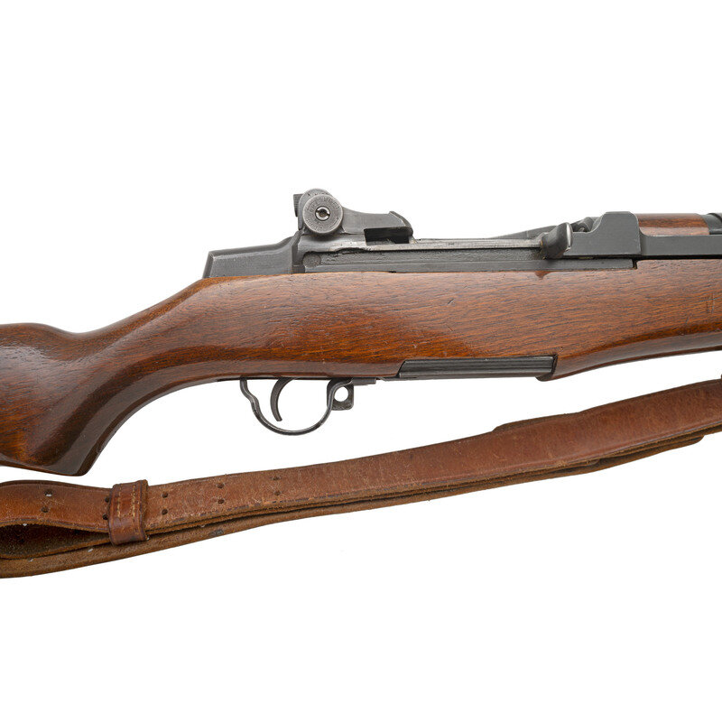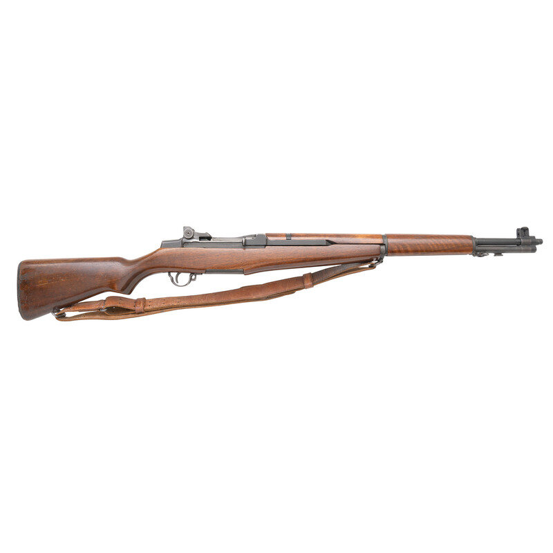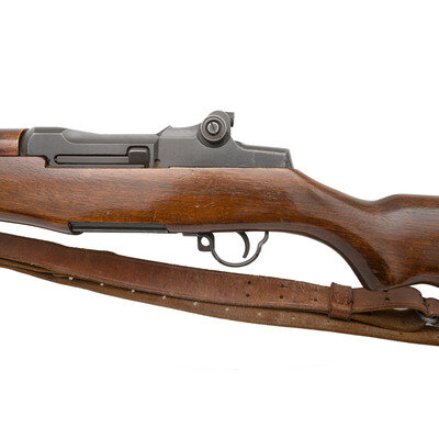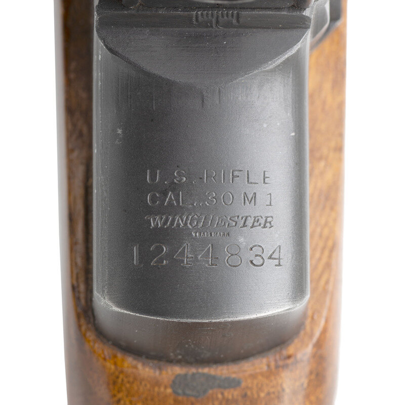 .308 cal. 24" barrel. SN: 1244834. Parkerized finish receiver and barrel mounting walnut stock. Semi automatic long stroke piston driven gas operated rifle fed by internal magazine charged by en-bloc clips. Receiver dates to October 1942. Assembled as a high power target rifle with mixed parts. Standard Winchester receiver markings, DOD cartouche on counterpane, {circle}-P in pistol grip on glass bedded stock. NM marked operating rod, SA marked bolt, 12 65 dated barrel. Barrel is caliber marked 7.62MM. NM marked rear sight. Includes a M1907 pattern leather sling. Sight adjustment information taped to reverse of stock. {C&R)