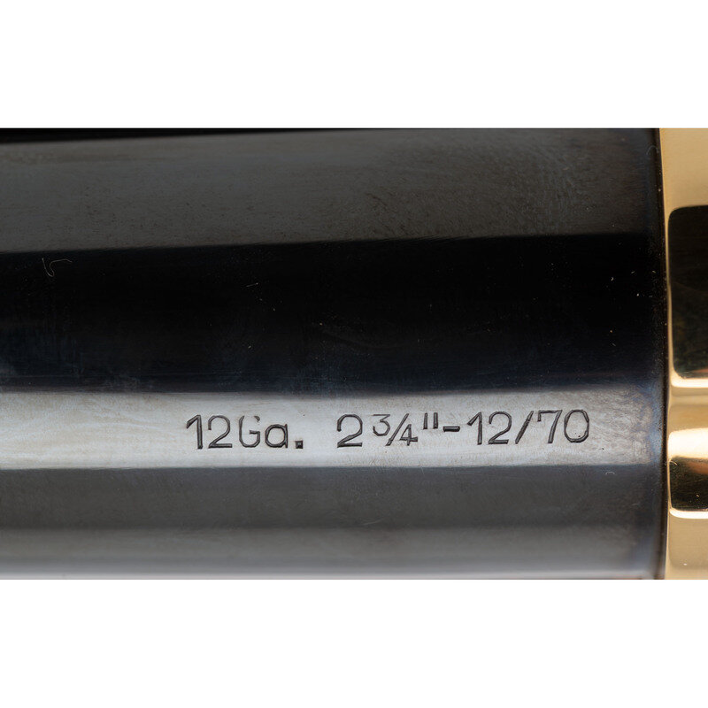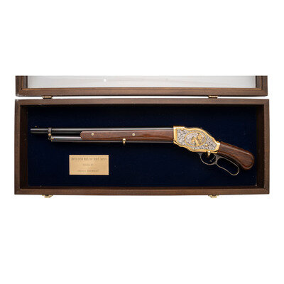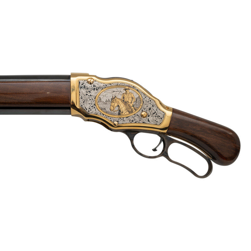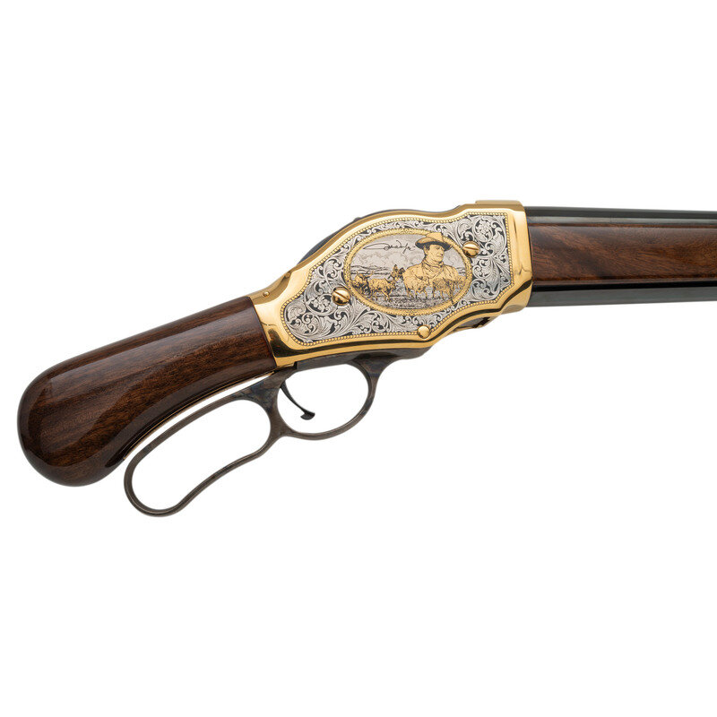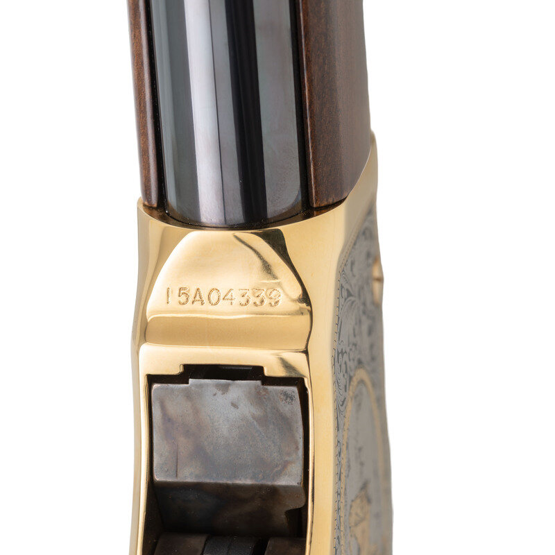 12 Gauge. 18.5" barrel length. SN: 15A04339. Gold plated frame with blued barrel and casehardened lever mounting polished wood furniture. Lever action repeating shotgun fed by tubular magazine. Receiver shows {John Wayne with cowboy and herd of cows} surrounded by silver filigree on right side with {John Wayne on horseback} surrounded by silver filigree on left. Tang marked JW/0091 followed by silver filigree. Item includes original hard case and accessories along with certificate of authenticity. {MODERN}