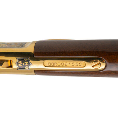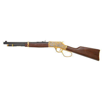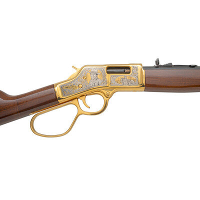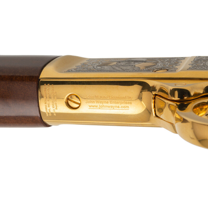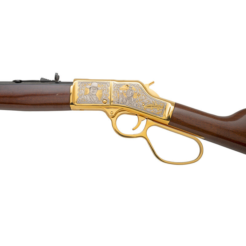 .45 Colt. 17" barrel length. SN: BBR002155C. Gold plated engraved frame with blued barrel mounting polished wood stock and forend. Lever action hammer fired repeating rifle charged by tubular magazine mounting buckhorn rear sight and front gold bead. Receiver features decorations of John Wayne's famous western performances with banknote engraving surrounded by enclosed floral scrolling. Top of tang marked JW/0044 followed by serial number. Left of barrel marked HENRY REPEATING ARMS-BAYONNE NJ-MADE IN USA. Bottom of receiver marked with America Remembers licensing information. Item includes wooden show case and certificate of authenticity. {MODERN}