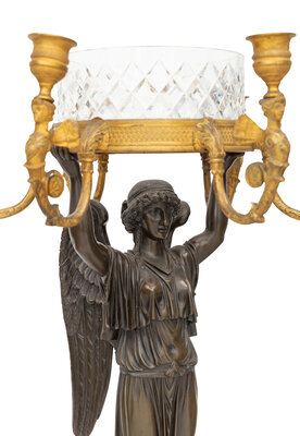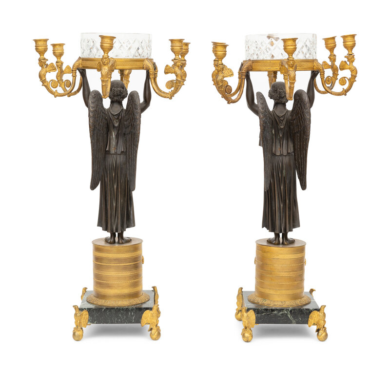 A Pair of Empire Style Gilt and Patinated Bronze and Cut Glass Six-Light Candelabra
