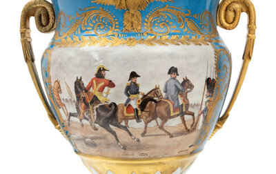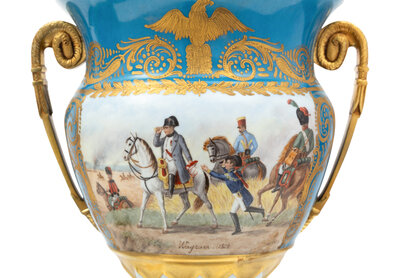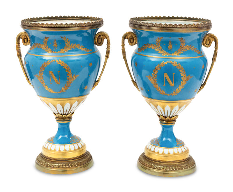 A Pair of Sevres Style Porcelain and Gilt-Bronze Mounted Napoleonic Urns
